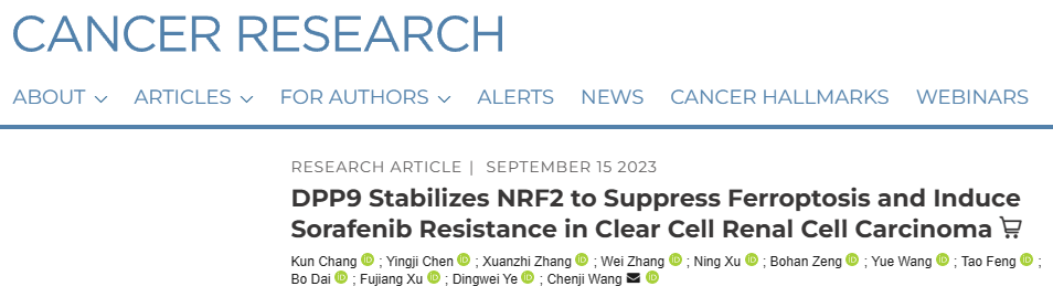 2023年9月15日,成人动漫 王陈继团队、成人动漫 附属肿瘤医院叶定伟、戴波团队和西南医科大学附属医院徐富江团队合作在Cancer Research在线发表了题为DPP9 Stabilizes NRF2 to Suppress Ferroptosis and Induce Sorafenib Resistance in Clear Cell Renal Cell Carcinoma的研究论文。该研究发现揭示DPP9通过竞争性结合KEAP1,稳定NRF2蛋白水平,激活氧化应激信号,抑制细胞铁死亡,从而诱导了ccRCC靶向治疗耐药。