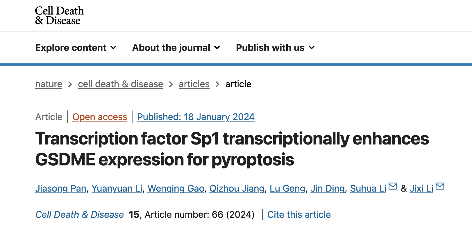 2024年1月,成人动漫 李继喜教授团队在《Cell Death & Disease》杂志在线发表了题为Transcription factor Sp1 transcriptionally enhances GSDME expression for pyroptosis的研究论文。该研究通过实验证明了肿瘤细胞中,转录因子Sp1结合GSDME启动子区域,激活GSDME的表达。对于这条通路的抑制可以增强肿瘤细胞对化疗药物的抵抗作用,并且该机制与STAT3转录调控通路有协作关系,与DNA甲基化有拮抗关系,揭示了Sp1在程序性死亡过程中的重要功能。
