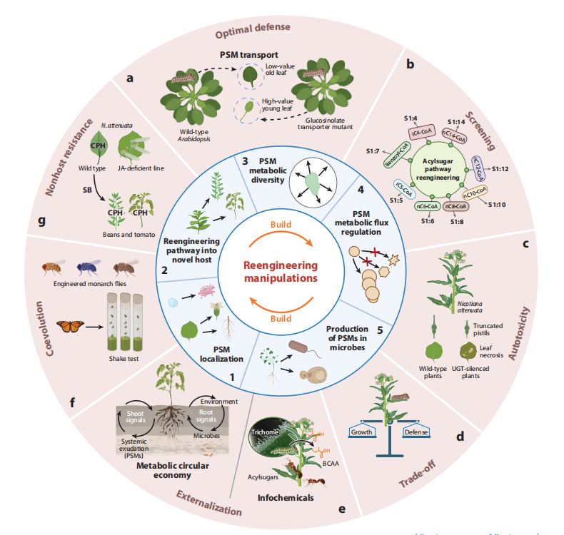 近日,成人动漫 白悦辰团队受邀在 Annual Review of Plant Biology杂志发表了题为Using synthetic biology to understand the function of plant specialized metabolites的长文综述,对近六十年来的植物防御机制理论进行了全面的回顾,并详细梳理了利用合成生物学技术合成植物次生代谢产物的最新研究进展。此外,文章整合了植物生物学(尤其是达尔文进化论)、化学生态学及合成生物学的相关理论,从学科交叉视角提出合成生物学在植物功能代谢领域研究的新范式。