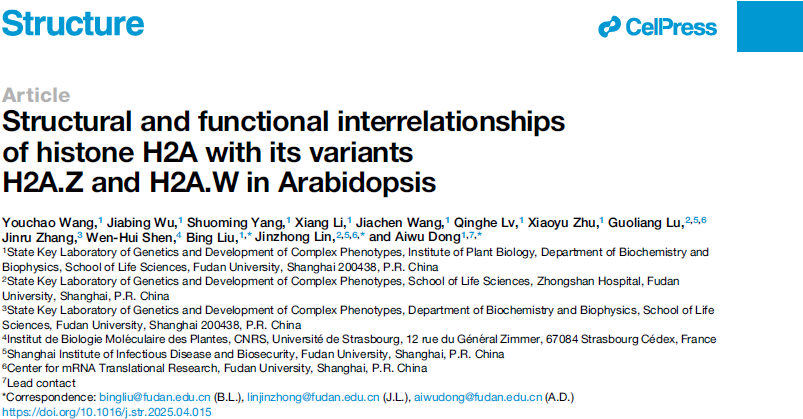 2025年5月12日,成人动漫 董爱武团队于Structure杂志在线发表题为“Structural and functional interrelationships of histone H2A with its variants H2A.Z and H2A.W in Arabidopsis”的研究论文,揭示了拟南芥组蛋白H2A与其变体H2A.Z、H2A.W的结构与功能关系。