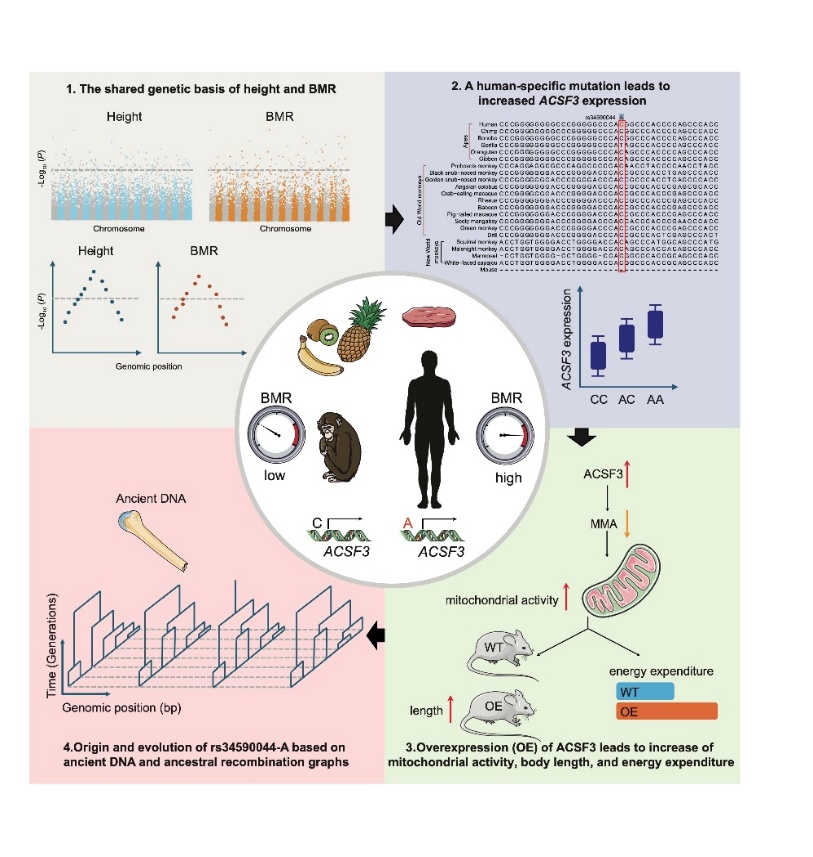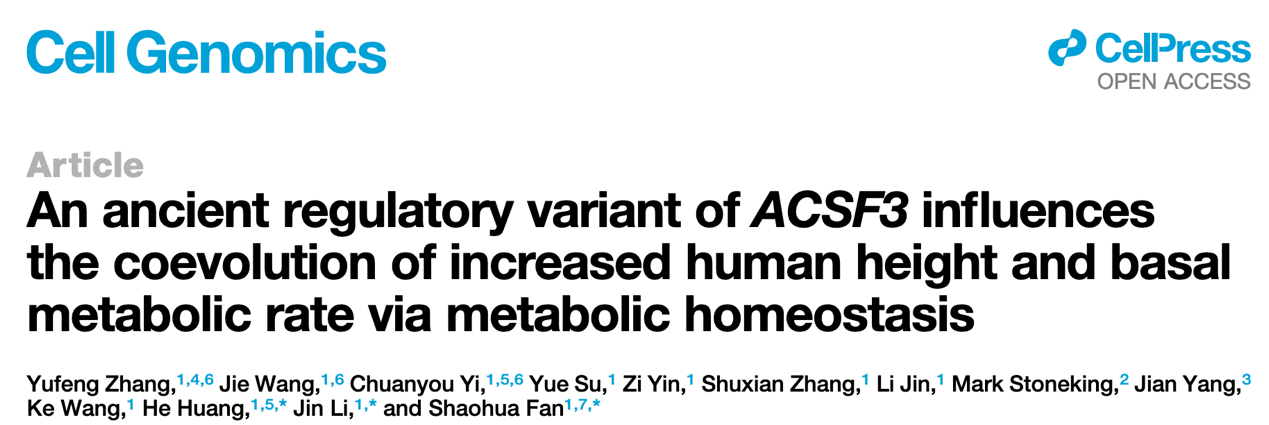 2025年5月22日,成人动漫 樊少华研究员、李晋研究员和黄河研究员合作在Cell Genomics发表了题为An ancient regulatory variant of ACSF3 influences the coevolution of increased human height and basal metabolic rate via metabolic homeostasis的研究论文,揭示了人类身高与基础代谢率共进化的遗传基础。