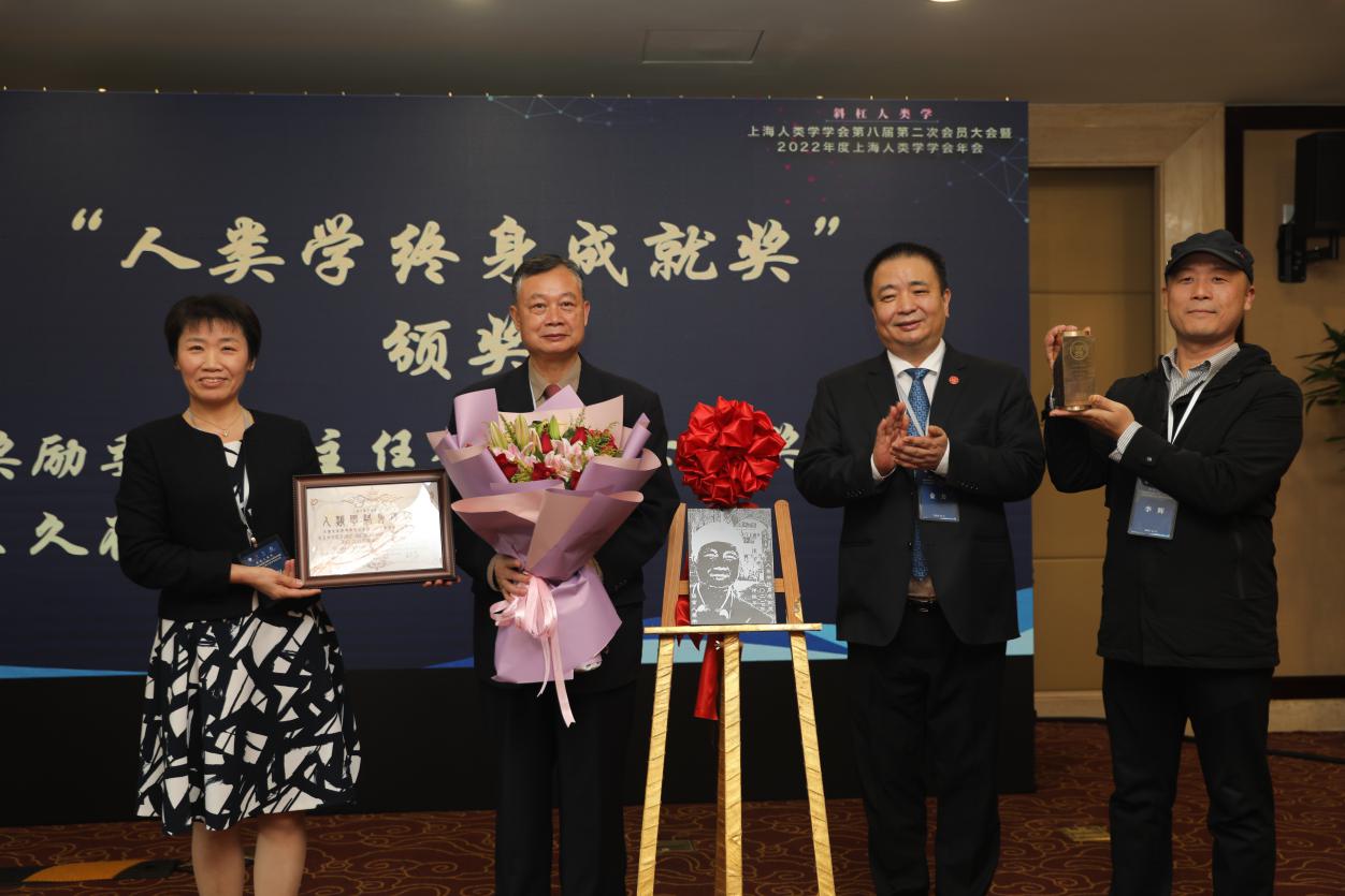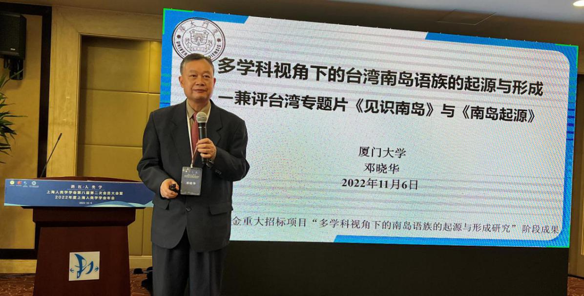 “人类学终身成就奖”又称“金琮奖”,由上海人类学学会设立,颁发给在国内和国际有影响力的人类学家,以表彰其在各自研究的人类学领域所作出的卓著贡献。该奖获奖者均为在中国及国际人类学界有相当造诣、德高望重,在专业领域作出重大贡献并引领人类学发展,年龄在65岁及以上的人类学工作者。该奖项每年颁发一次,被上海市社会科学界联合会评为“上海市社会科学学会特色活动”。2022年人类学终身成就奖颁发给厦门大学的邓晓华教授,以表彰他在语言人类学领域和台海一体研究中做出的卓越贡献。金力院士为邓晓华教授颁发了金琮奖杯,王久存会长颁发了奖状。邓晓华1957年出生于福建连城,故乡丰富的语言环境为其后来研究语言人类学打下了基础。文革后他考入龙岩师专,受到大批名师指导。后师从于华中工学院严学宭先生,终于华中科技大学获得博士学位。在厦门大学人类学与民族学系任教三十余年,担任厦门大学人类学学科、民族学学科、语言学学科、考古学学科博士生导师。兼任福建工程学院特聘教授,福建省高层次优秀人才“百人计划”“福建省文化名家”,中国人类学学会副会长。邓晓华教授主攻语言人类学、比较语言学、汉语方言学、文化遗产学、博物馆学,用生物统计学的一系列方法定量地分析语言学,整体构建了侗台语、南岛语、汉藏语及其方言的发生学关系,并对台海人群渊源关系作出了全面系统的人类学分析和论述。邓晓华教授为人谦逊,为学刻苦,为思周缜,在推动人类学跨学科研究方面做出了典范。颁奖典礼上,邓教授为会员做了讲座《多学科视角下的台湾南岛语族的起源与形成》,揭示台湾人群起源于大陆人群的多学科充分证据。