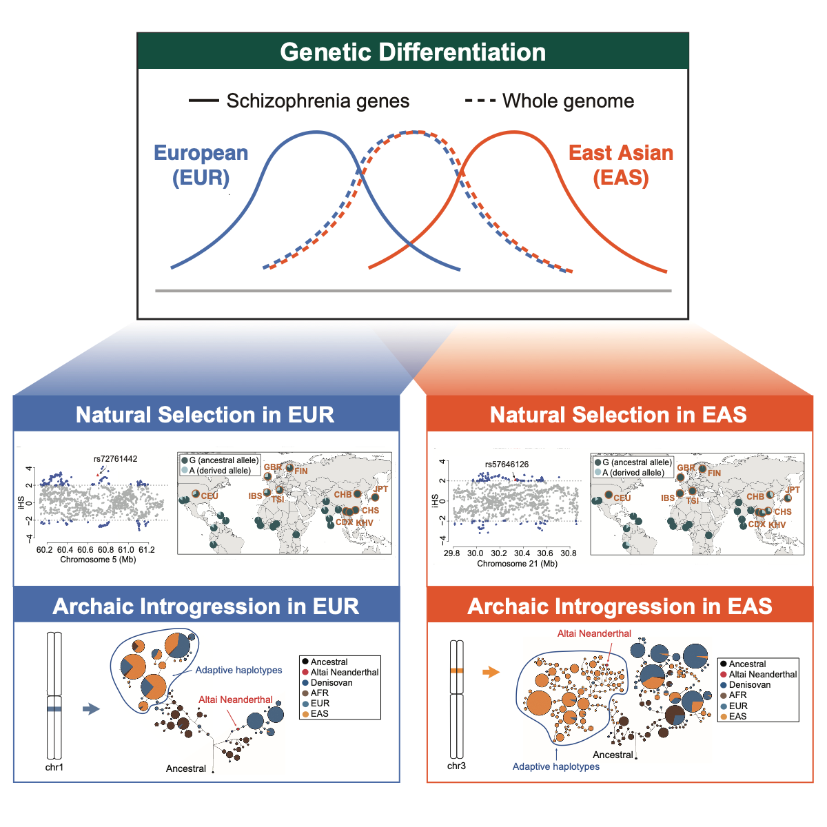 研究发现的精神分裂症基因人群遗传分化产生机制是什么?欧亚人群各自的演化历程对其有何影响?一方面,研究团队注意到高度分化的精神分裂症基因变异在欧亚人群中经历了差异性的适应性演化。总体来说,该类基因在东亚人群中经历较强的正向选择(突变因有利于个体的生存或繁衍而在群体中频率抬升)。一个典型的例子是位于LTN1基因的错义突变rs57646126,其衍生型等位基因A在东亚人群中的频率达到23%并表现出单体型水平的正选择信号,而该等位基因在欧洲人群中非常罕见。此外,欧洲人群中也存在特异性的正选择变异,例如位于ZSWIM6基因的rs72761442,在该位点携带非致病等位基因G的个体样本占本研究分析的欧裔样本总数的43.9%。另一方面,远古人类的基因渗入可能影响了欧亚东西方人群的精神分裂症遗传易感性差异。例如,欧洲人群在染色体1q21.2区域具有疑似尼安德特人来源的单体型,该单体型携带非致病性等位基因;与之相对的是,东亚人群位于染色体3p21.31区域的疑似尼安德特人来源单体型携带了致病性等位基因,并且受到正选择。因此,欧亚人群与远古人类的基因交流,以及人群独立发生的环境适应性演化,可能共同驱动了精神分裂症易感基因的人群遗传多样性演化。