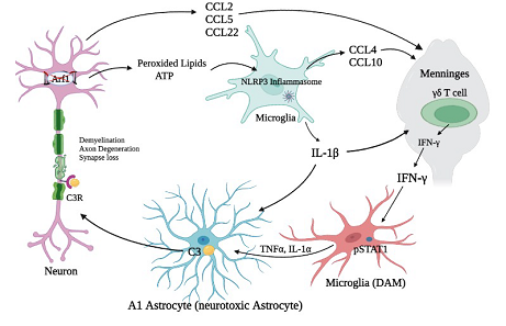 作者首先发现在小鼠后脑和脊髓神经元中特定敲除ARF1基因会通过释放过氧化脂质和ATP,激活小胶质细胞中的NLRP3炎症小体-IL-1β以及反应性星形胶质细胞。作者检测了IFN-γ缺失背景下Arf1敲除小鼠(Arf1-/- IFN-γ-/-)的表型,发现与 ARF1敲除小鼠(Arf1-/-)相关的行为学异常、突触缺失、轴突脱髓鞘和轴突变性在 IFN-γ 缺失后几乎完全受到抑制,并且在 Arf1 敲除小鼠中,A1型反应性星形胶质细胞和补体 C3 显著增加。随后作者检测到趋化因子CCL2, CCL3, CCL4, CCL5, CCL20, CCL22, CXCL10和IL-1β被招募并激活脑膜中的γδ T细胞,分泌出进入脑实质的IFN-γ,进而激活小胶质细胞。作者进一步构建出C3缺失背景下Arf1敲除小鼠(Arf1-/-C3-/-)缺陷小鼠,发现C3缺失显著抑制了Arf1敲除小鼠的部分神经退行表型,包括部分行为学异常,星形胶质细胞活化和髓鞘形成相关蛋白的减少。同时,作者也进一步探究了星形胶质细胞分泌的C3蛋白的神经元毒性以及神经元中的C3a受体(C3aR1)的表达。团队还通过体外实验证明C3-C3aR1 通路介导 Arf1 敲除小鼠中激活的 A1 星形胶质细胞的神经毒性功能,激活的星形胶质细胞促进神经元死亡(图一)。 最后,作者还证明 Arf1 缺失诱导的神经免疫 IFN-γ 神经胶质增生途径存在于人类 ND 尤其是在 ALS 和 MS 中。