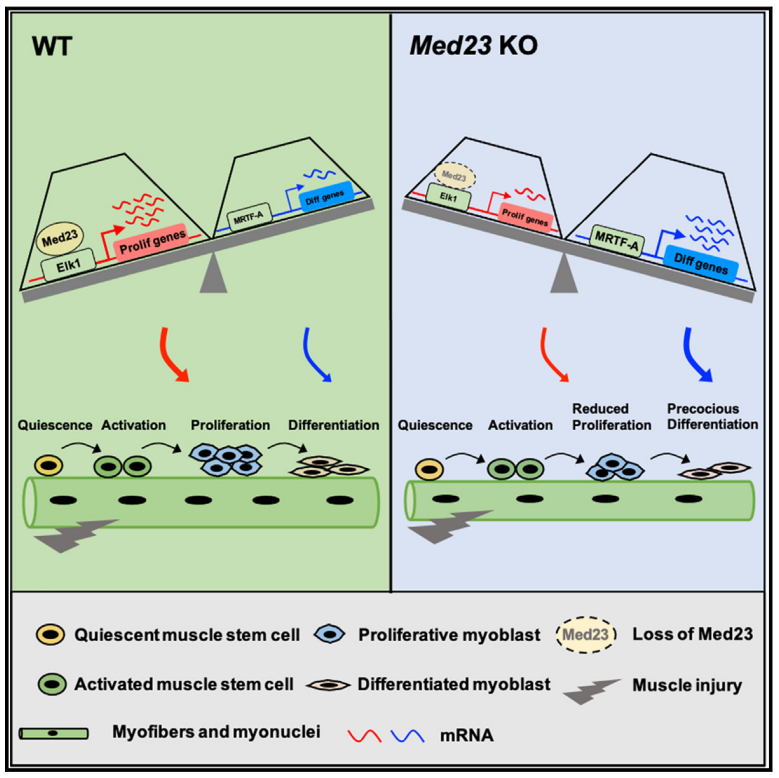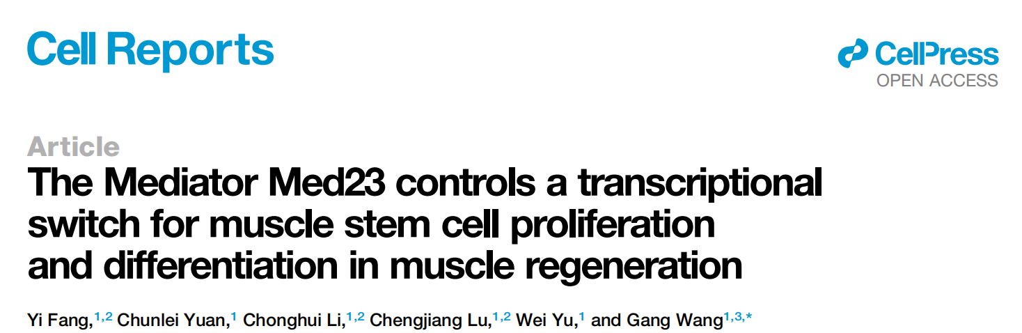 2024年4月30日,成人动漫 王纲教授团队在Cell Reports杂志在线发表了题为The Mediator Med23 controls a transcriptional switch for muscle stem cell proliferation and differentiation in muscle regeneration的研究论文。该研究通过小鼠体内外实验,发现Med23亚基缺失会使肌肉干细胞MuSCs增殖减缓并表现出预分化,从而导致肌肉再生能力减弱。