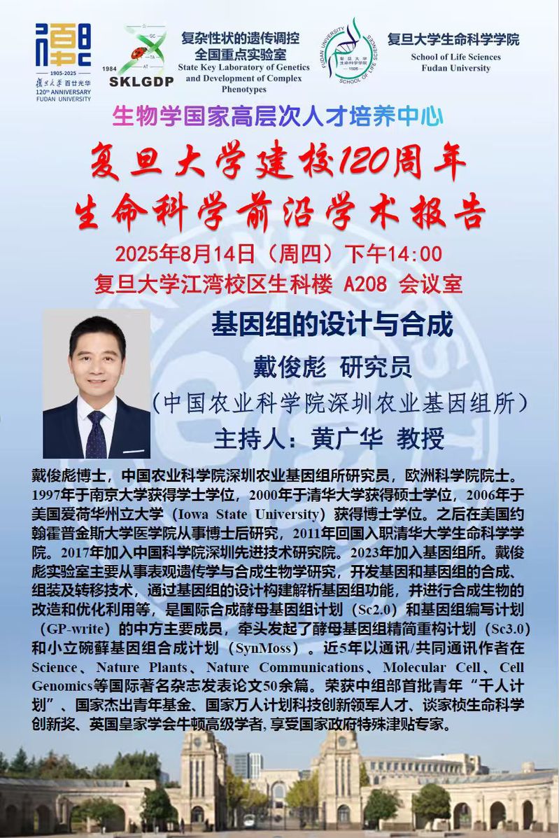 生命科学前沿学术报告-2025-08-14(周四) 14:00,戴俊彪 研究员 (中国农业科学院深圳农业基因组所)