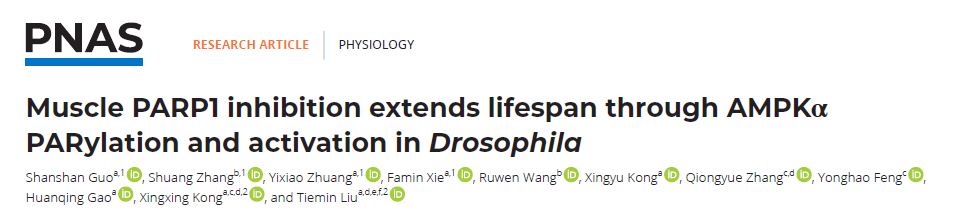 2023年3月23日,成人动漫 刘铁民教授团队和孔星星教授团队在PNAS杂志上合作发表了一篇题为Muscle PARP1 inhibition extends lifespan through AMPKα PARylation and activation in Drosophila的论文,该研究指出在年老果蝇中抑制PARP1,可延长寿命,并发现在骨骼肌中敲低PARP1可通过下调AMPK的多糖ADP-核糖基化修饰、增加AMPKα的活性,后者通过上调PGC-1α和PINK1的表达导致线粒体周转加速,肌肉代谢增加、功能增强,阐释PARP1/AMPK参与精准调控衰老进程的分子机制。