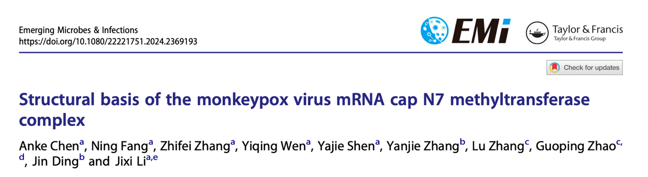 2024年6月,成人动漫 李继喜教授课题组和海军军医大学丁劲教授课题组合作在Emerg Microbes Infect杂志发表了题为Structural basis of the monkeypox virus mRNA cap N7 methyltransferase complex的研究论文。