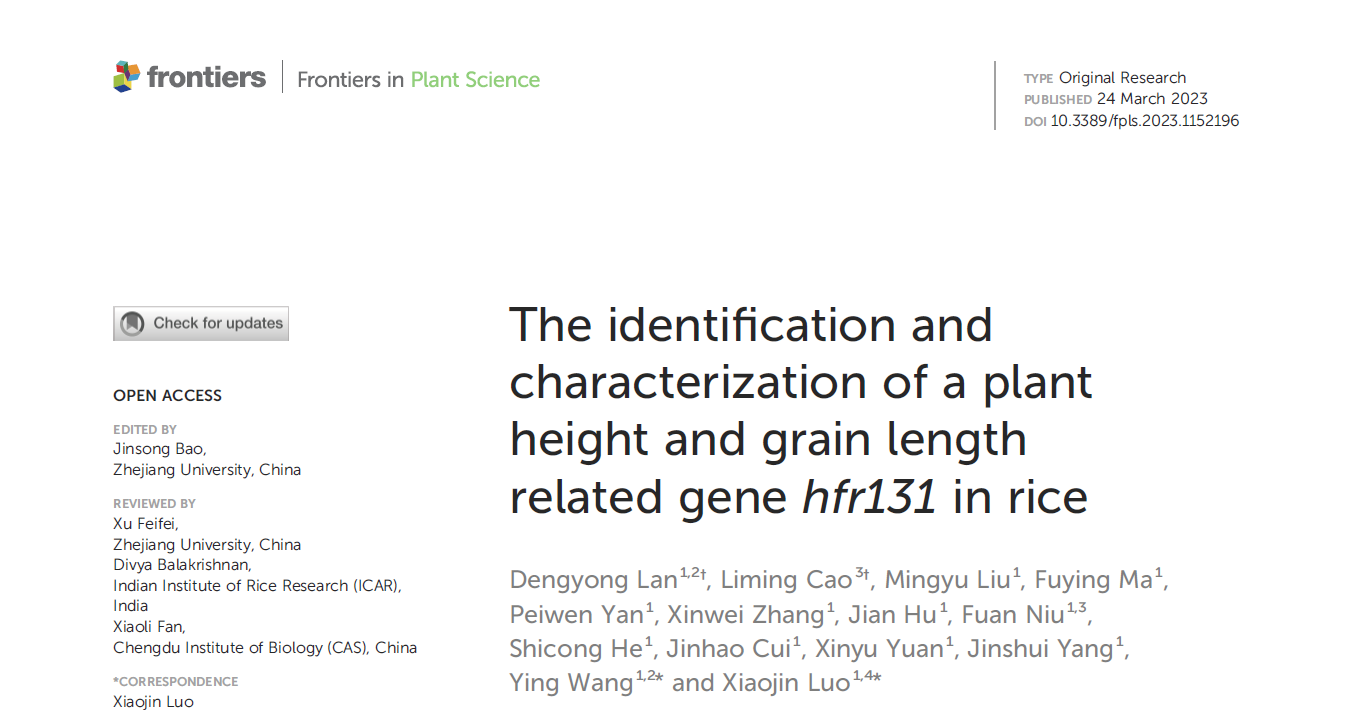2023年3月24日,成人动漫 罗小金课题组在Frontiers in Plant Science在线发表了题为“The identification and characterization of a plant height and grain length related gene hfr131 in rice”的研究论文。该研究采用功能基因组和群体基因组相结合的方法,揭示了BR与生长素协调调控水稻株高和粒型的机制,发现了有利于提高水稻产量的优势单倍型组合。