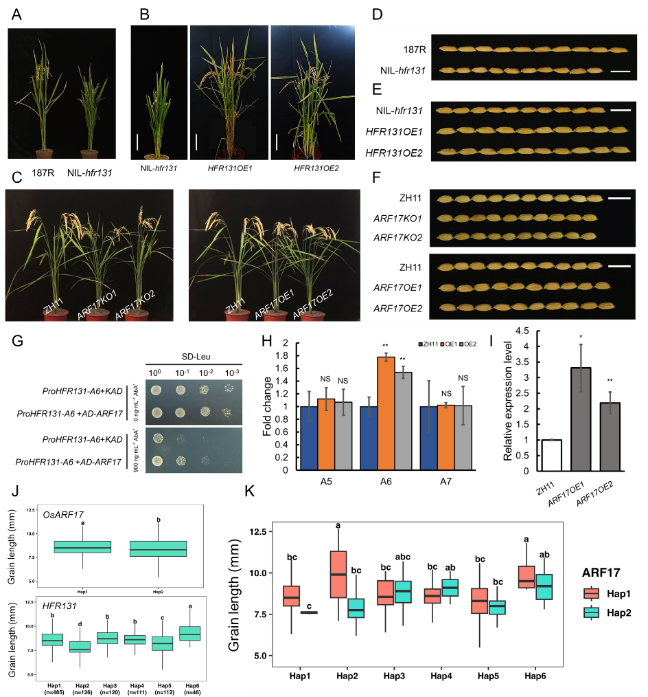 该研究以长雄野生稻(Oryza longistaminata)和籼稻187R为遗传材料,构建并鉴定到了一个株高显著变矮、粒长显著变短的近等基因系NIL-hfr131,通过精细定位和基因表达验证,发现hfr131是水稻BR受体基因OsBRI1的新等位基因。在NIL-hfr131的转录组数据中发现多个与赤霉素和生长素相关的基因表达水平发生了显著的变化,表明hfr131可能通过协调多种激素调控水稻株高和粒长。生长素响应因子OsARF17被发现是HFR131的上游调控基因,OsARF17敲除或过表达株系与NIL-hfr131或HFR131过表达株系在株高和粒长上具有相似的表型,结合酵母单杂、ChIP、qPCR等实验进一步证实了OsARF17能够与HFR131启动子区结合,促进HFR131的表达,且OsARF17敲除株系对BR的敏感性显著下降,表明OsARF17-HFR131能够沟通BR和生长素来调节水稻株高和粒长。此外,利用RFGB(//www.rmbreeding.cn)对OsARF17和HFR131单倍型进行二因素分析,发现OsAFR17Hap1/HFR131Hap6单倍型组合能最为显著的增加水稻粒长,为高效的分子育种提供了重要的分子依据。
