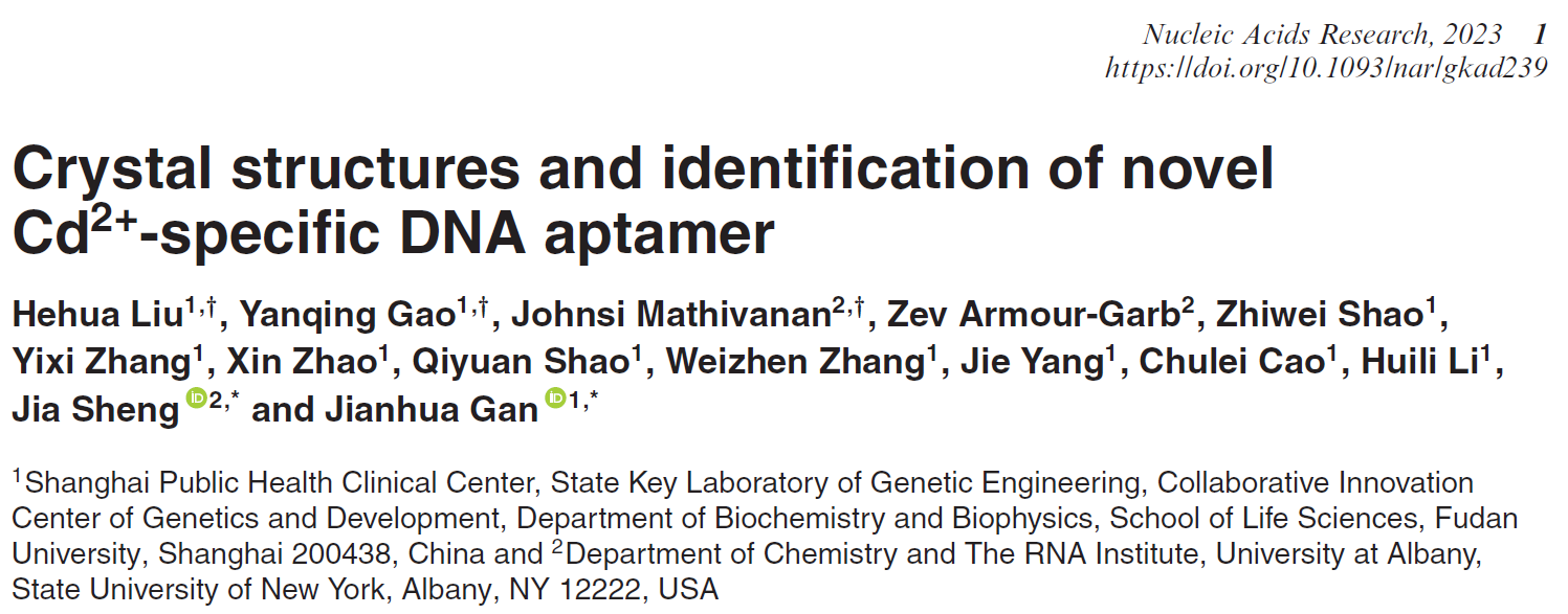 2023年4月4日,成人动漫 甘建华课题组和纽约州立大学盛佳课题组合作在Nucleic Acids Research上发表了题为“Crystal structures and identification of novel Cd2+-specific DNA aptamer”的文章,报道了Cd2+与四种DNA适配体复合物的晶体结构,首次阐明了DNA适配体识别Cd2+的结构基础。