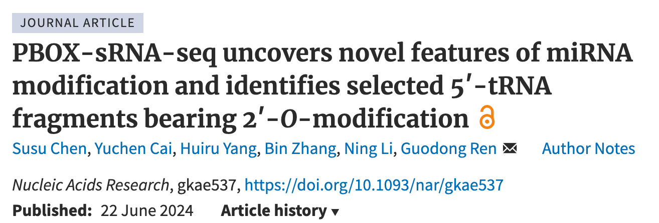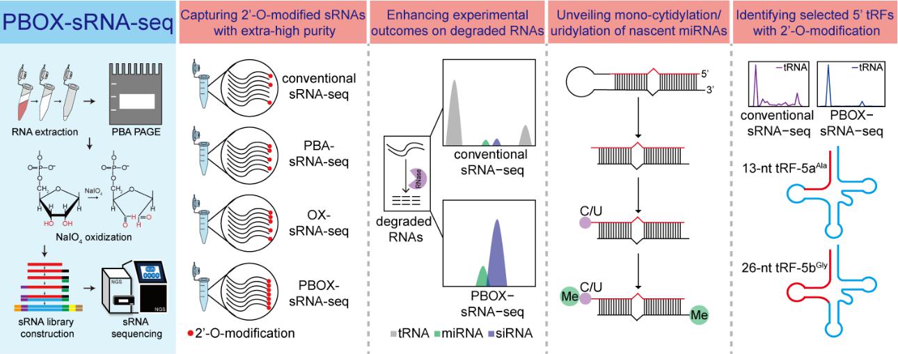 任国栋课题组在Nucleic Acids Research杂志在线发表了题为“PBOX-sRNA-seq uncovers novel features of miRNA modification and identifies selected 5’-tRNA fragments bearing 2’-O-modification”的研究论文。该论文借助hen1-2弱突变体同时含有甲基化sRNA及非甲基化sRNA(可通过长度和非模板加尾进行区分)的特点,系统评估了PBA变性凝胶电泳分离(PBA-sRNA-seq)、NaIO4处理(OX-sRNA-seq)以及联合处理(PBOX-sRNA-seq)测序方法对末端修饰小RNA测序的影响,发现PBOX-sRNA-seq具有最高的信噪比。