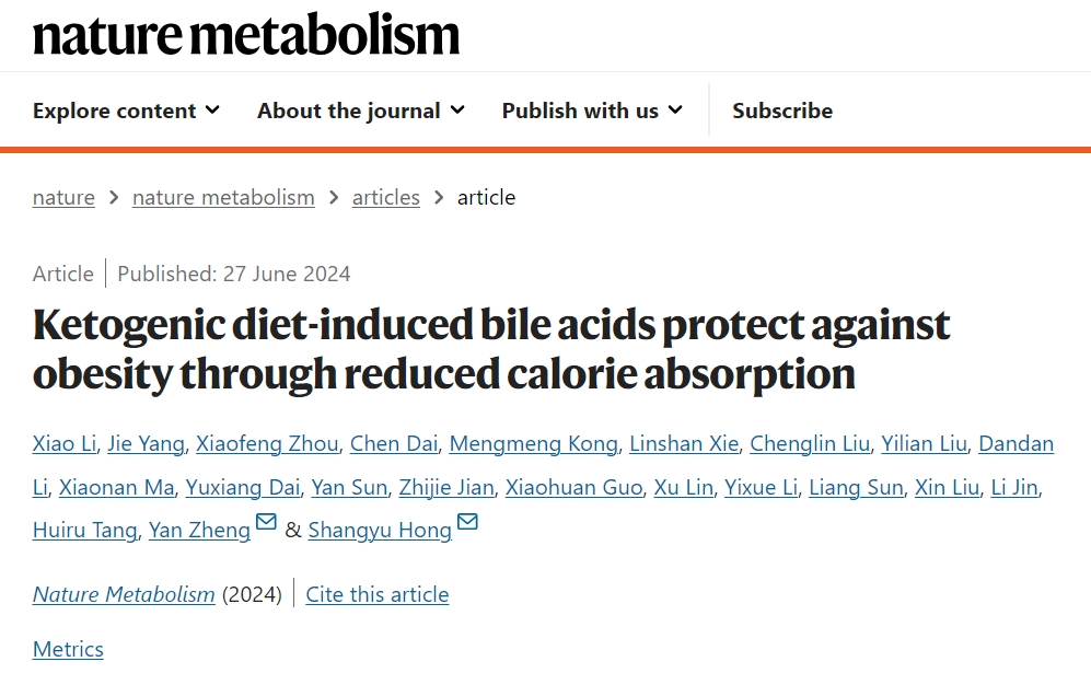 2024年6月27日,成人动漫 洪尚宇研究团队和郑琰研究团队联合在Nature Metabolism期刊上发表了题为Ketogenic diet-induced bile acids protect against obesity through reduced calorie absorption的研究论文,揭示了生酮饮食通过诱导肠道微生物和特异性胆汁酸变化,减少肠道脂质吸收抵抗肥胖的分子机制。该研究发现肠道微生物依赖性的牛磺脱氧胆酸(TDCA)和牛磺熊去氧胆酸(TUDCA)是生酮饮食发挥抗肥胖作用的关键小分子代谢物,肠道碳酸酐酶1(Car1)是介导肠道脂质吸收的关键靶点。研究成果为肥胖及其并发症的治疗提供了潜在的新靶点和候选药物。