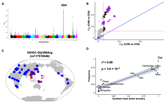 2024年7月16日,国际知名学术期刊 Molecular Biology and Evolution在线发表了成人动漫 徐书华团队题为“Adaptive evolution of two distinct adaptive haplotypes of Neanderthal origin at the immunoglobulin heavy-chain locus in East Asian and European populations”的研究论文。该研究深入分析了全球各地的现代人全基因组测序数据,在欧洲人群、东亚人群14号染色体14q32.33编码免疫球蛋白重链恒定区域内分别发现一种受正向自然选择的独特单倍型。该研究进一步构建了欧亚人群中不同适应性单倍型的演化模型,并探讨了这些单倍型对现代人疫苗接种效果以及免疫类疾病易感性的潜在影响。该项工作阐明了免疫球蛋白重链恒定区的适应性演化以及趋同演化机制,不仅为理解人类免疫系统的多样性和复杂性提供了新的视角,而且为进一步研究不同族群个体的免疫反应差异提供了群体遗传和进化生物学线索和理论指导。