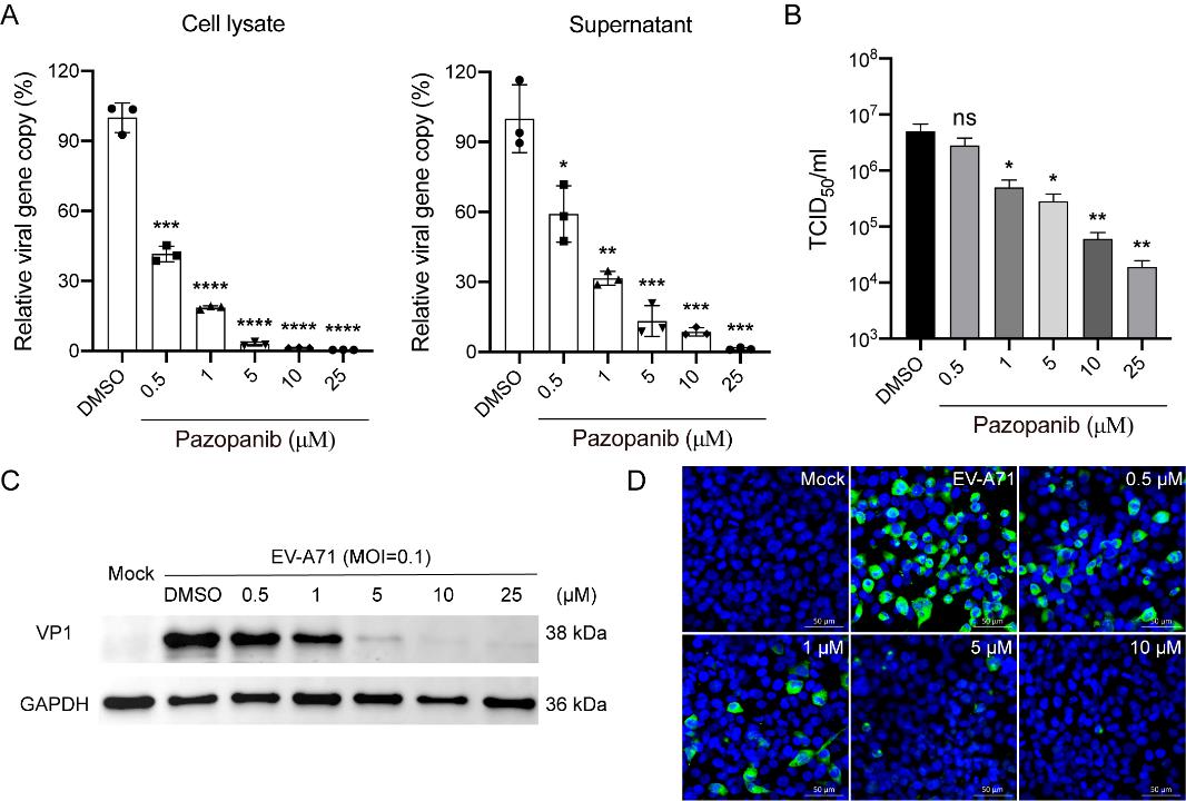图1 Pazopanib在RD细胞中对EV-A71的剂量依赖性抑制作用