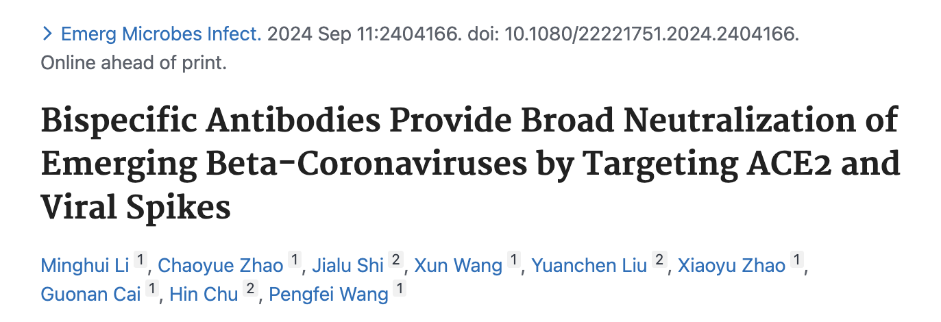 2024年9月11日,成人动漫 王鹏飞团队联合香港大学微生物系朱轩团队于知名期刊Emerging Microbes & Infections发表题为“Bispecific Antibodies Provide Broad Neutralization of Emerging Beta-Coronaviruses by Targeting ACE2 and Viral Spikes ”的论文。该研究成果令人振奋,表明双特异性抗体(bsAbs)不仅能中和SARS-CoV-2及其变种,还可广泛适用于其他β冠状病毒,包括SARS-CoV、MERS-CoV以及动物来源的冠状病毒。这些bsAbs展现出对多种致病株及其变异的持续有效性,其全面的中和谱使它们成为未来疗法开发的有力候选者。