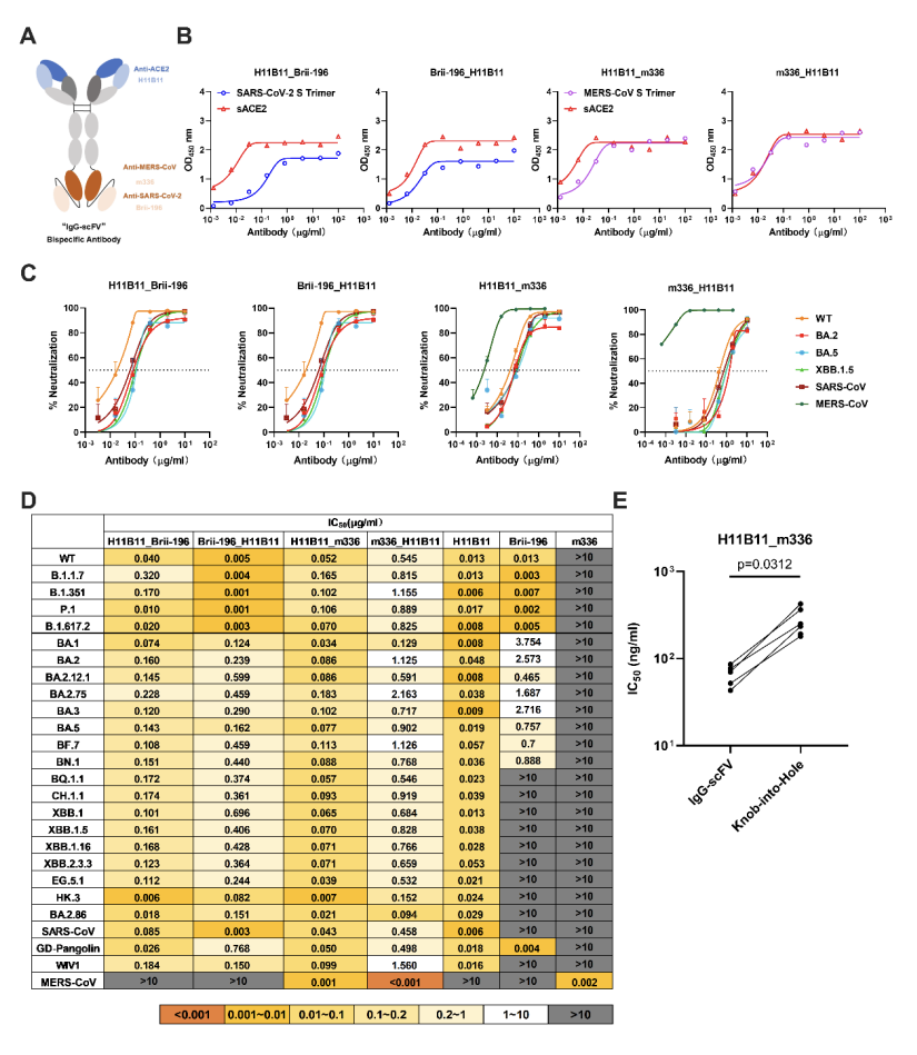 该团队开发的双特异性抗体采用一种创新策略:一端与病毒抗原结合,有效中和病毒并阻止其附着及进入宿主细胞;另一端则靶向特定细胞受体,阻断病毒与受体的相互作用。研究人员运用了“Knob-Into-Hole” CrossMab或IgG-scFv技术,将针对SARS-CoV-2或MERS-CoV的抗体与针对ACE2的抗体成功配对,构建了一套全面的双抗文库。特别地,抗体H11B11_m336 和 m336_H11B11展示出对所有测试的SARS-CoV-2变异株、SARS-CoV、MERS-CoV以及多种动物冠状病毒的有效中和作用。这一策略不仅有效应对当前疫情带来的挑战,而且还为预防未来可能的人畜共患病毒溢出事件提供了强有力的工具。