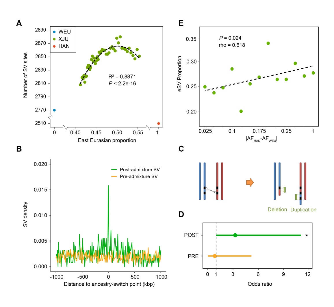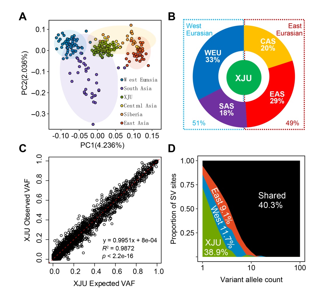 遗传混合(admixture)是人类演化史上普遍而重要的过程和演化驱动力,但遗传混合如何影响结构变异(Structural Variants, SV)的产生、频率变化及其功能效应,长期以来缺乏系统研究。近期,研究团队以典型欧亚混合人群——新疆维吾尔族为对象,利用来自汉族与 Simons Genome Diversity Project(SGDP)欧亚人群作为祖源参照,系统描绘了维吾尔族的 SV变异图谱,揭示了遗传混合对人群基因组结构变异多样性与调控功能的重要影响。