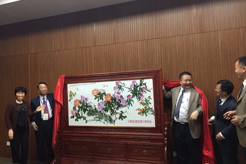 在全体与会人员的掌声中,成人动漫 副校长金力,原成人动漫 院长苏德明,校友代表陈启宇、余国良,校外联处处长潘俊为“成人动漫 校友会”揭牌。