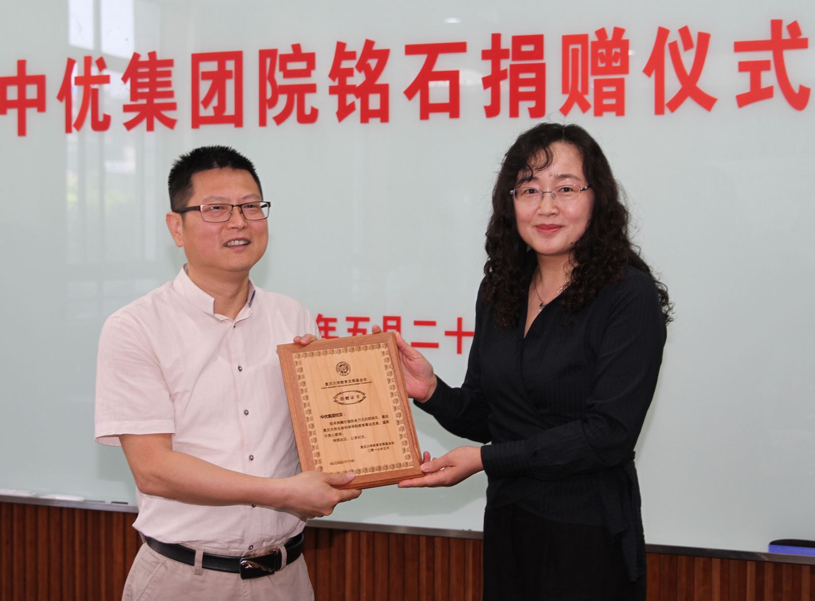 外联处副处长刘莉向中优集团授予捐赠证书。