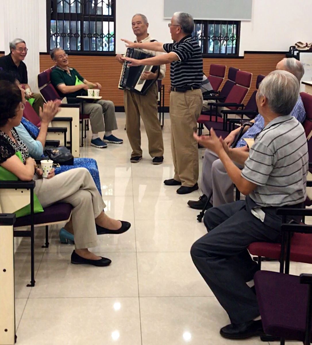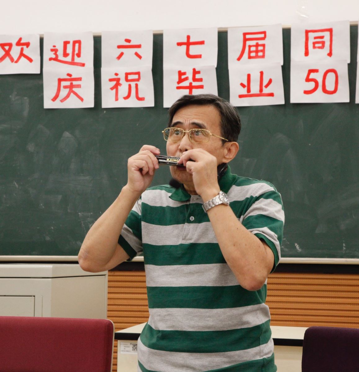 校友们虽然已过古稀,但非常有活力,两位校友表演了手风琴演奏和口琴演奏,两位女同学还分享了养生保健心得,看,两位女同学多么年轻!