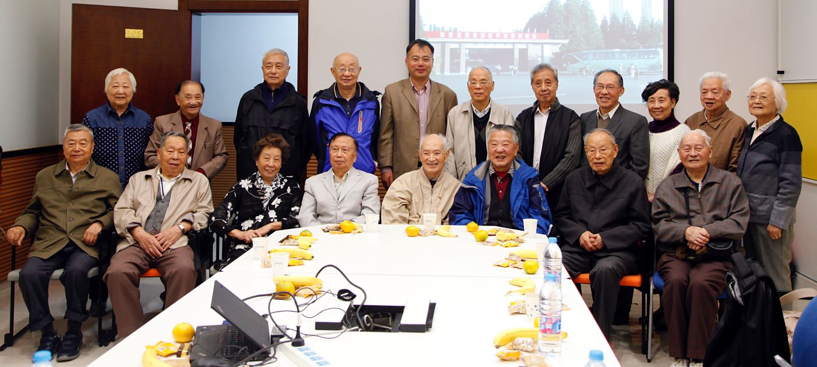 57届校友聚会由李亦德校友联络组织,校友们在立人生物楼103会议室座谈,观看徐业华校友制作的从1985年开始的历年活动聚会、校庆100周年活动视频录像、周德庆校友制作的活动照片集PPT,有校友因为身体原因未能参加聚会,特意写来诗词祝贺聚会圆满顺利。