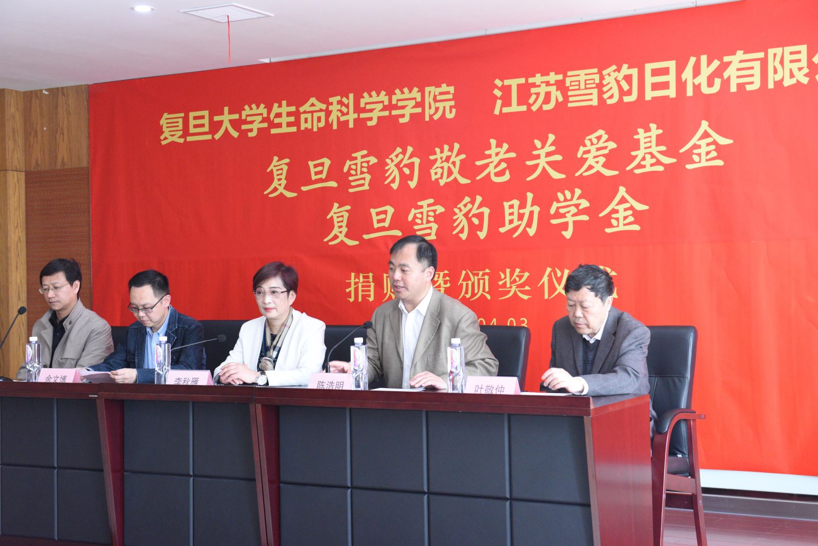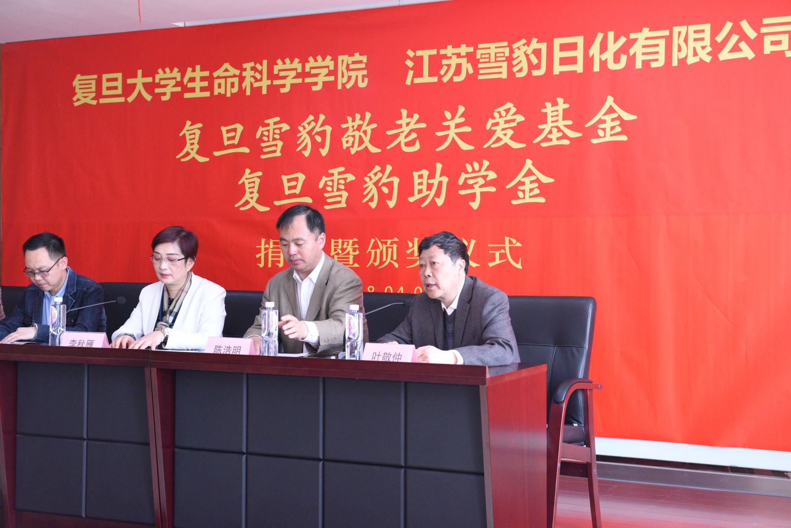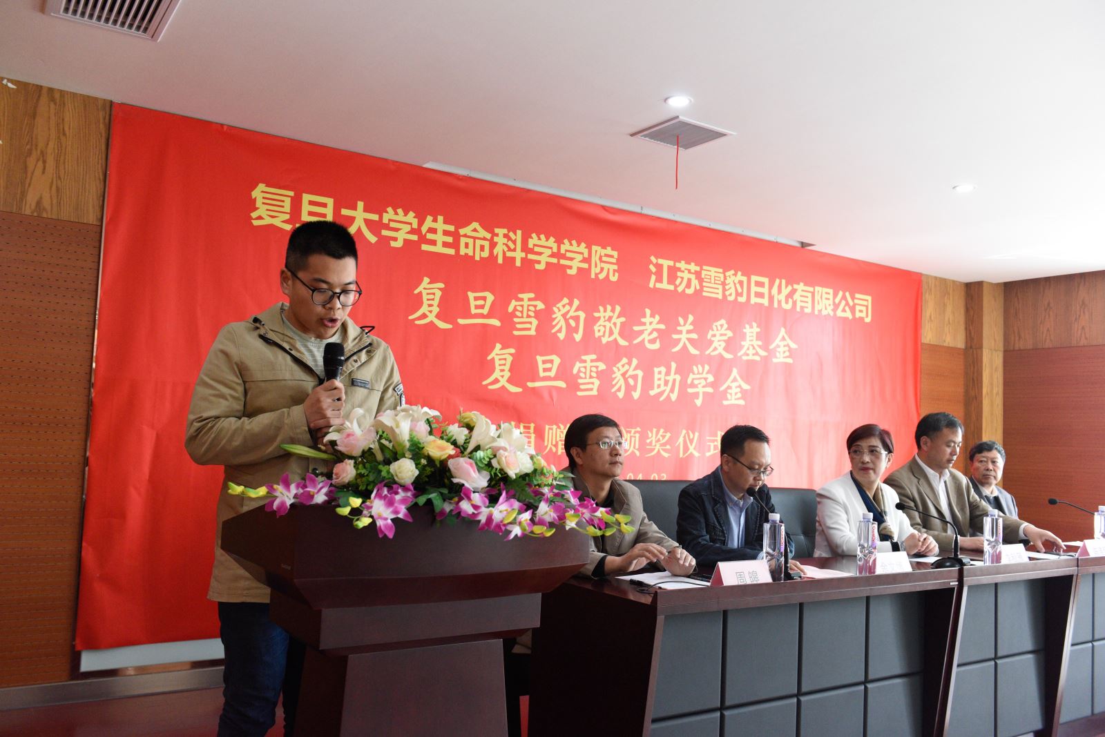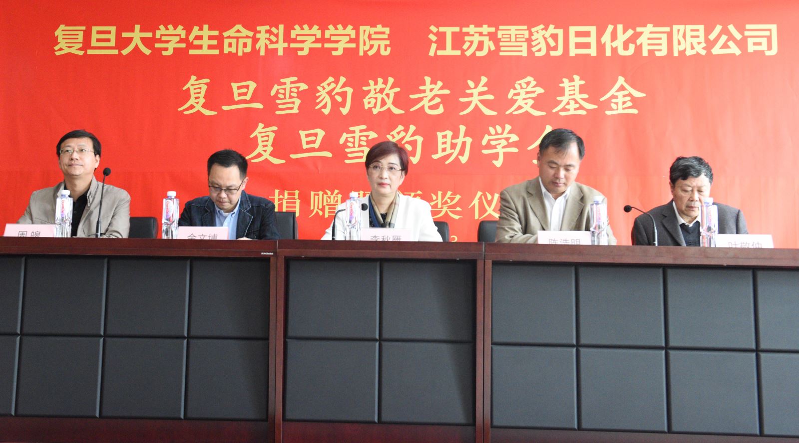4月3日上午,坐落在江苏江阴的江苏雪豹日化有限公司成功举办“复旦雪豹敬老关爱基金”和“复旦雪豹助学基金”颁奖仪式。成人动漫 党委书记陈浩明、党委副书记余文博、学院前党委书记、院退管工作委员会副主任叶敬仲、校友秘书王晓静、雪豹助学金受助学生代表等参加了颁奖仪式。