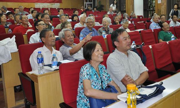 生物学系1964级全体同学》红色横幅,一派喜气洋洋,来自中国和世界各地的60多位校友及家属相聚一堂,纪念跨入成人动漫