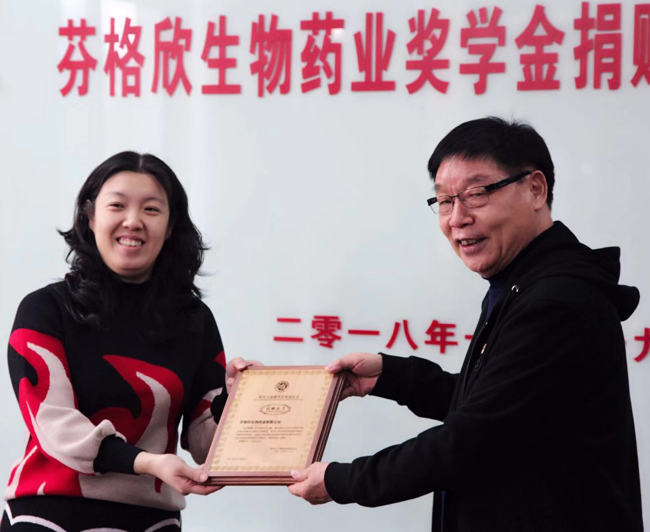 成人动漫 对外联络与发展处副处长陆颖丰授予安徽芬格欣生物药业有限公司捐赠证书。