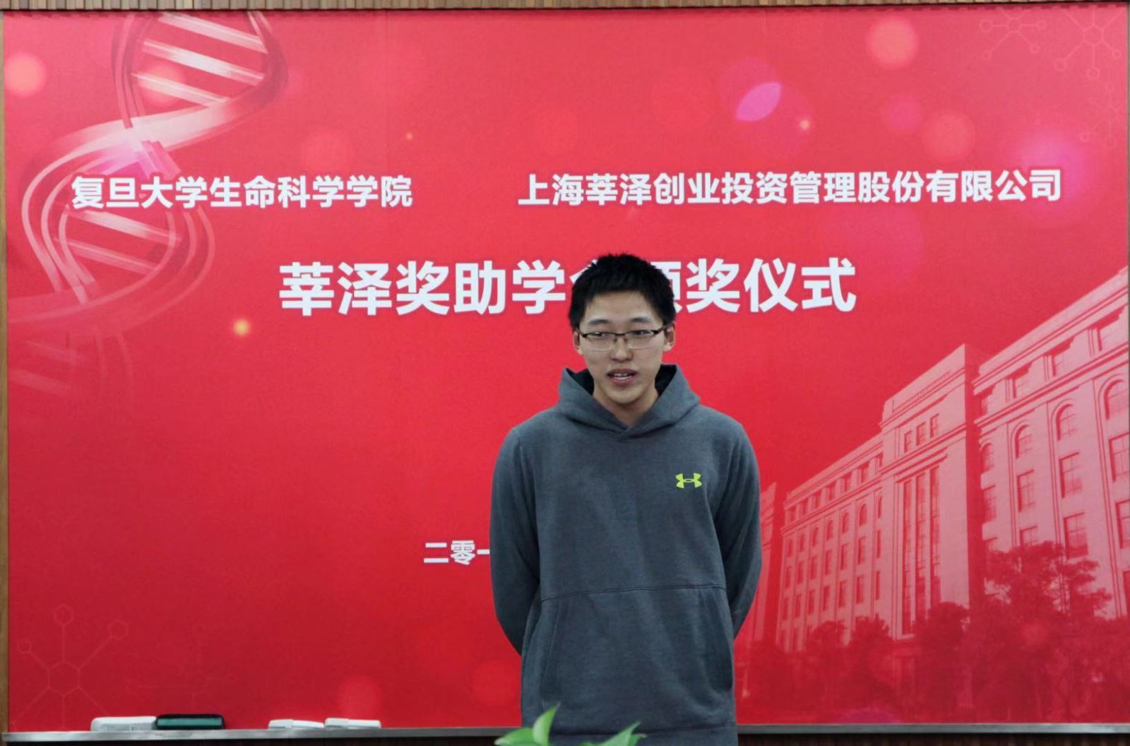 获奖学生陈新元发表获奖感言,陈同学首先向莘泽公司表示了感谢,感谢学院和莘泽公司对获奖学子成绩的肯定。陈同学详细回忆了自己选择生物学的心路历程,他认为,选择生命科学是给了生命更多的可能,让更多的人,能抓住一束叫做“生”的光亮,而未来,可能就隐藏在这些可能中,而他希望能做的,就是能够使这些可能成为必然。他感谢莘泽公司支持着自己的梦想,今后一定会再接再厉,在生命科学的道路上勇敢坚定地走下去!