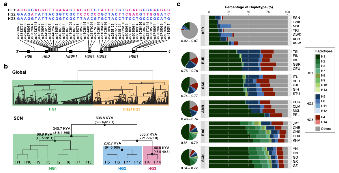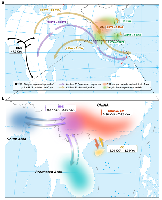 β-地中海贫血是一种由β珠蛋白基因(HBB)突变导致珠蛋白链合成障碍而引起的遗传性溶血性贫血,是经典的常染色体单基因隐性遗传病。β地贫在全球热带地区具有广泛分布,在我国广东、广西、海南等省份发病率较高,且严重致死、致残,是我国出生缺陷防治的重点疾病。我国南方地贫致病基因突变携带率超10%,部分地区高达近30%,且突变谱存在显著的地理和民族差异。然而,这些差异背后的演化机制长期未明。南方民族众多且人群遗传历史复杂,理解β地贫突变谱多样性的进化成因将对疾病防控产生重要意义。