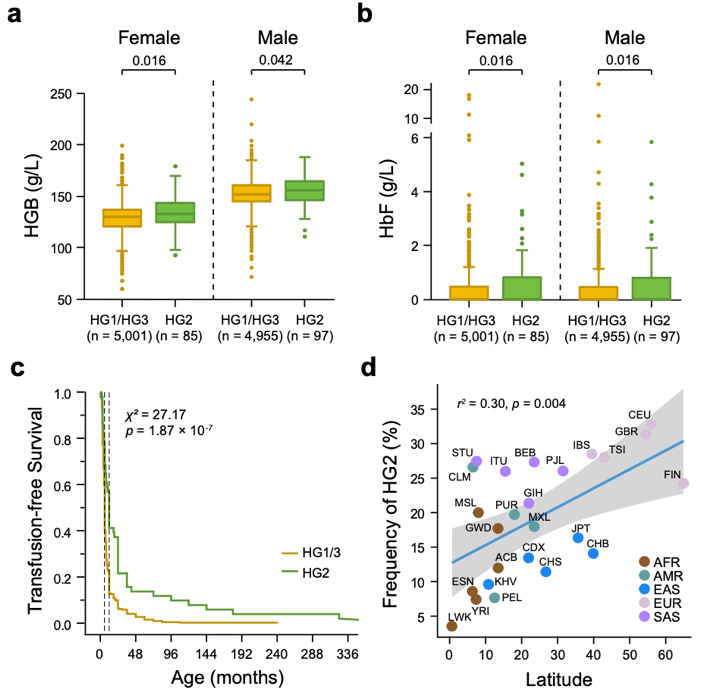最后,研究还发现:(1)在健康人群中,HG2单倍群与血红蛋白(HGB)和胎儿血红蛋白(HbF)水平升高显著相关;(2)在携带重型β地贫突变的患者中,HG2可能对临床表现具有缓解或修饰作用(图4)。这一结果为探索遗传修饰因子、改进风险评估和个性化精准治疗提供了直接线索。