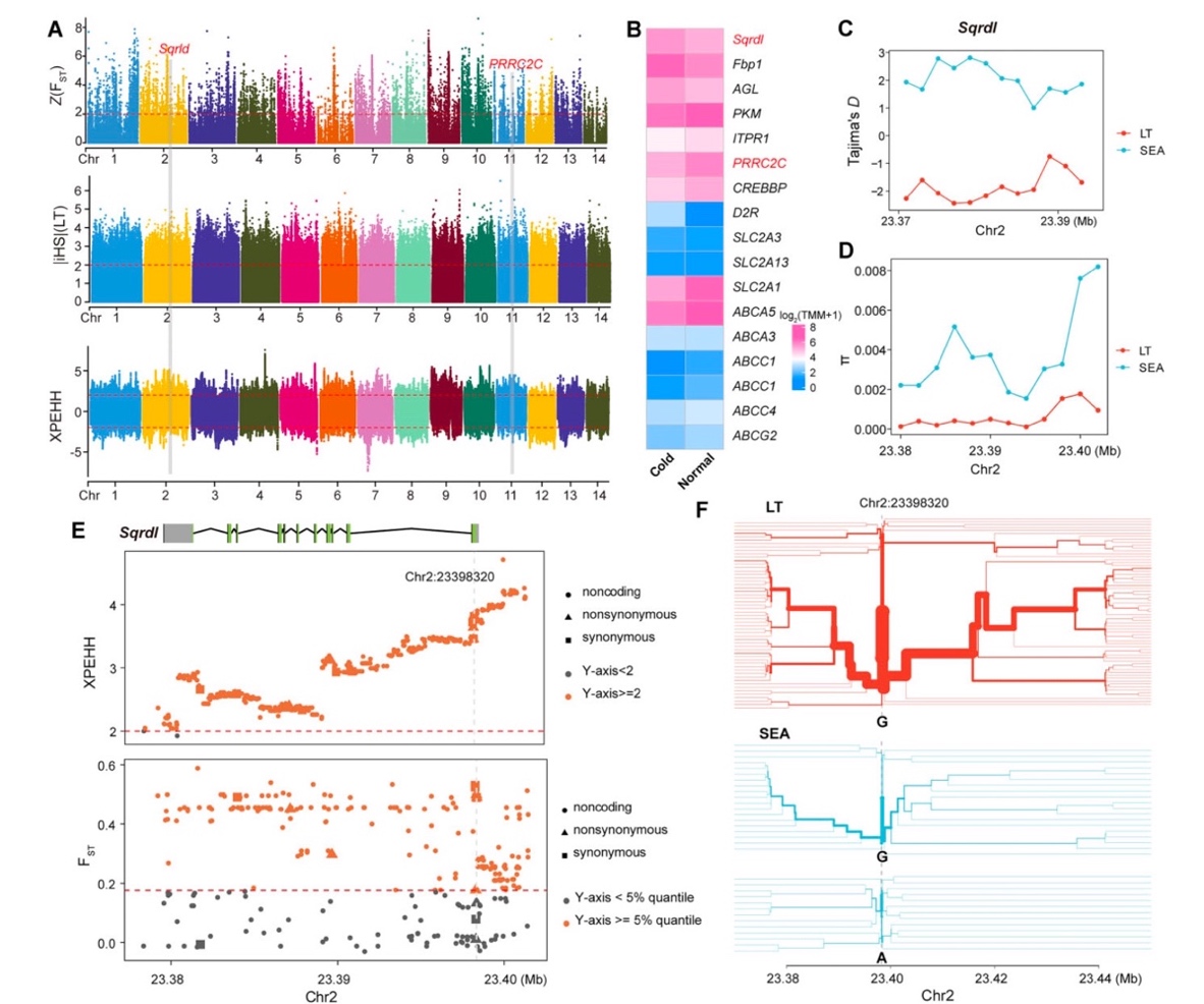 适应性进化是生物体在新环境中生存和繁衍的重要机制。起源于南美洲,近期迁移到亚洲,并快速扩张的小管福寿螺,或可成为帮助人们理解物种如何快速适应新环境的较理想的“模式生物”。小管福寿螺具有较强的环境适应能力,尤其是抗温度胁迫和抗病原入侵能力,大量研究表明,冬季低温是福寿螺扩张和迁徙的最大限制因素。本研究选取最冷月的最低温度作为主要环境因子,鉴定出了与低温适应相关的候选基因。其中,最为显著的是编码冷休克蛋白的基因CSDE1,且它在5′-UTR区域的一个特征单倍型在低温地区的样本中呈现较高频率。我们发现CSDE1的一个突变(Chr7: G. 27642529 A > G)与温度高度相关,即在大多数低温地区显示出最高的等位基因频率,但在高温地区频率接近为0。为了进一步研究CSDE1基因在冷暴露下的动态表达,实时定量PCR实验结果表明,将福寿螺暴露于寒冷环境下的第一个24小时内,其血细胞中CSDE1基因的表达水平显著升高,并在随后的4天内迅速下降,以上结果为CSDE1基因在福寿螺中的低温适应性研究提供了重要的线索(图3)。