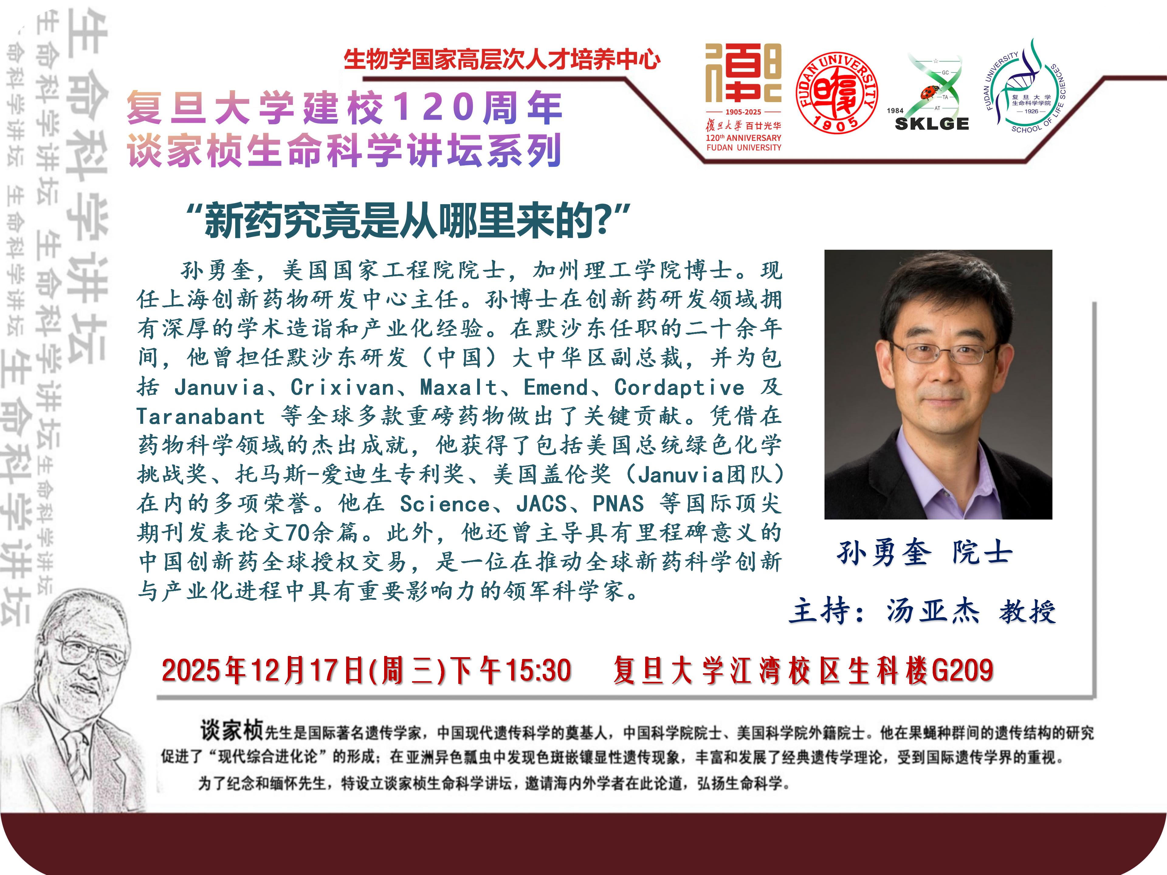 谈家桢生命科学讲坛-2025-12-17(周三)15:30,孙勇奎 院士(上海创新药物研发中心)