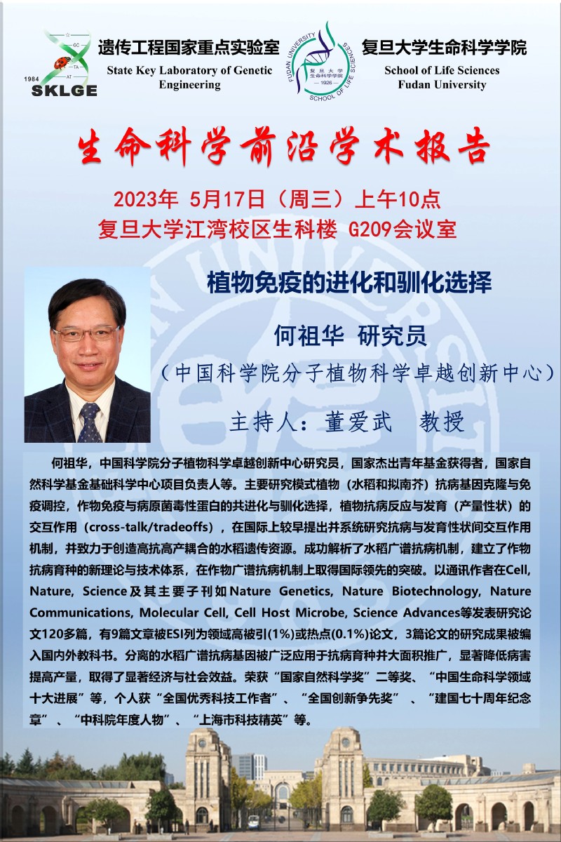 生命科学前沿学术报告-2023-5-17(周三)上午10:00,何祖华 研究员(中国科学院分子植物科学卓越创新中心)