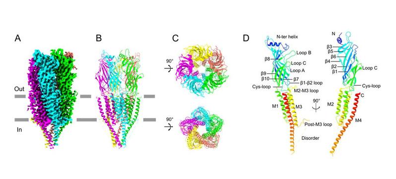 Cys-loop受体超家族是一类五聚体的配体门控离子通道,在人体神经系统中扮演关键角色,与多种神经退行性疾病相关。锌离子激活通道ZAC是最近才发现的一类Cys-loop受体蛋白,而它的结构信息在过去一直缺失。服部素之团队解析了来自青鳉的ZAC蛋白结构,该结构呈现子弹性状的五聚体构造,构成通道的每个单体都由四个跨膜螺旋和一个含N端螺旋和10个β-折叠的胞外结构域组成,表现出Cys-loop家族的常见构造。