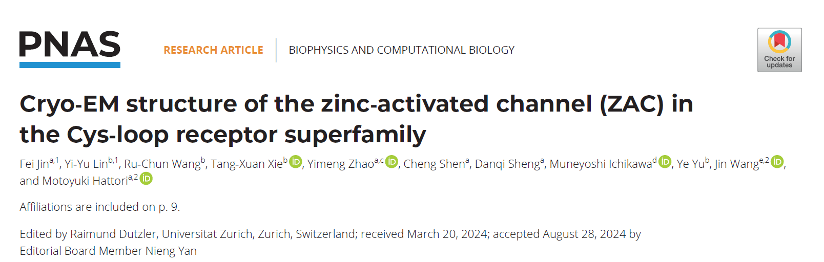 2024年10月24日,成人动漫 服部素之团队在PNAS发表文章“Cryo-EM structure of the zinc-activated channel (ZAC) in the Cys-loop receptor superfamily”。该项目由成人动漫 服部素之课题组与中国药科大学理学院汪津课题组合作完成。