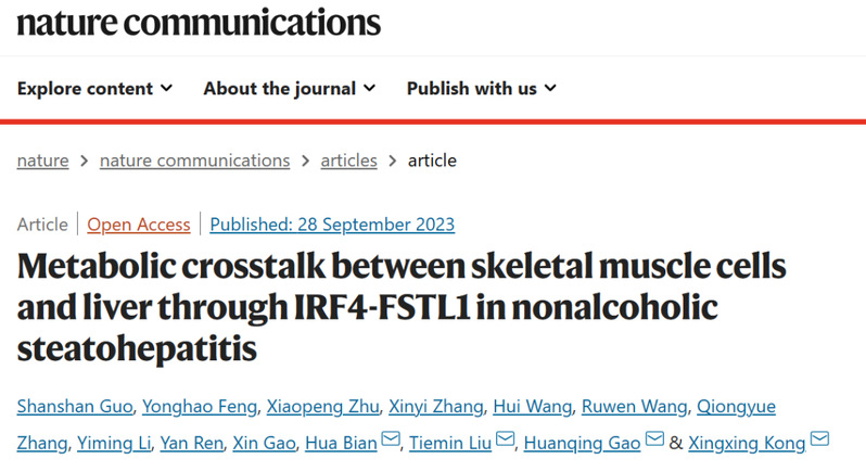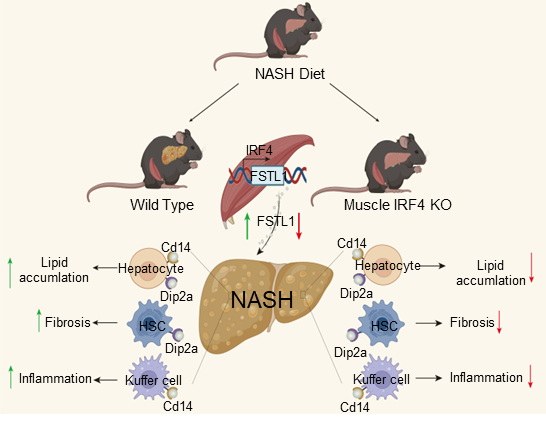 近日,成人动漫 生科院孔星星/高焕庆/刘铁民团队在Nature Communications杂志上合作发表了一篇题为Metabolic crosstalk between skeletal muscle cells and liver through IRF4-FSTL1 in nonalcoholic steatohepatitis的论文,该研究指出骨骼肌特异性敲除IRF4,给与NASH饮食后,表现出肝脏病理表型的改善。并发现F4MKO小鼠肌肉来源的FSTL1参与了IRF4介导了NASH进展。FSTL1进一步通过DIP2A和CD14受体调控肝脏脂代谢、降低炎症和纤维化,阐释了骨骼肌IRF4通过FSTL1-DIP2A/CD14通路在NASH发病机制发挥的关键作用。
