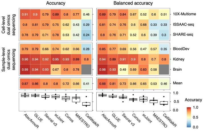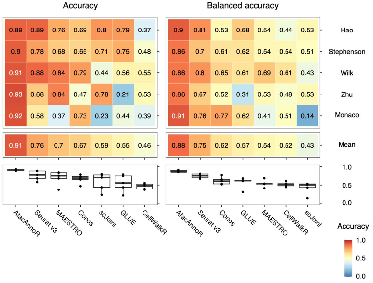 作者将AtacAnnoR 和Seurat v3(2019, Cell),GLUE(2022, Nature biotechnology),scJoint(2022, Nature biotechnology),Conos(2019, Nature methods), MAESTRO(2020, Genome biology)和 CellWalkR(2021, Genome biology)进行了比较。