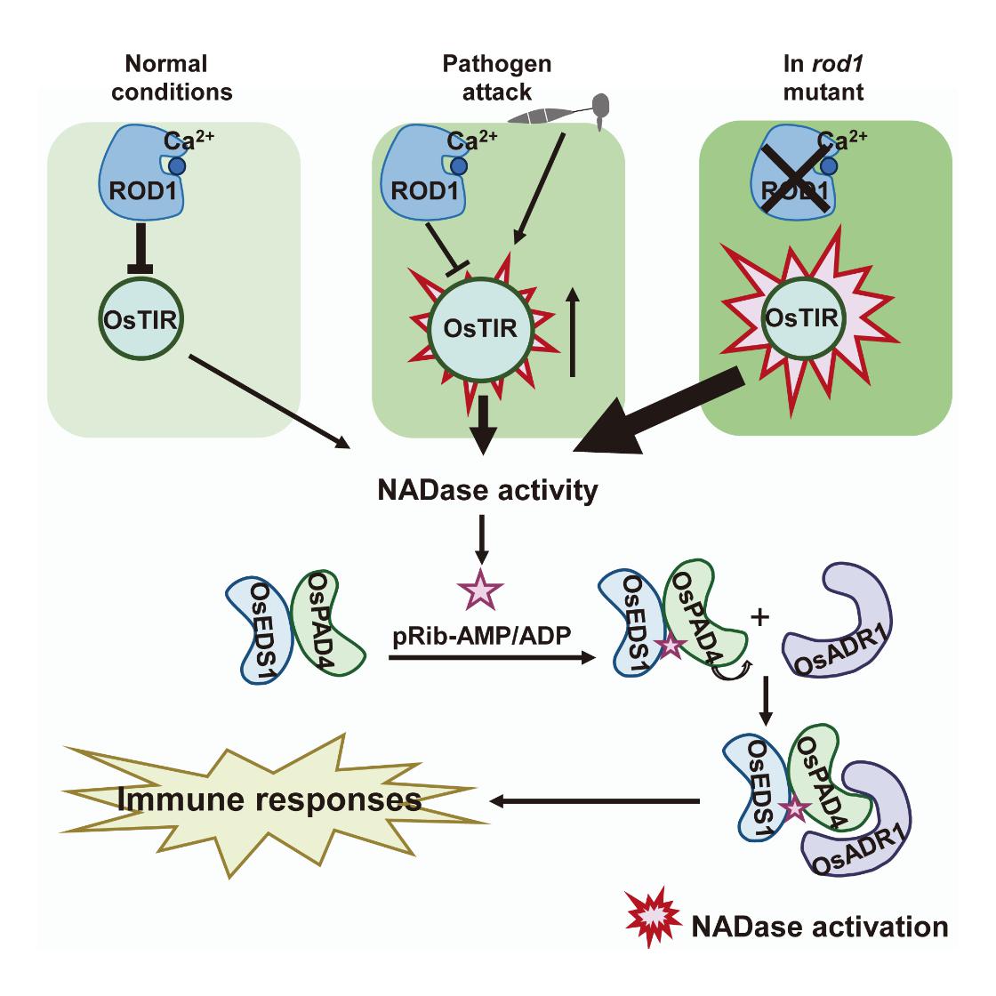 研究组通过遗传学、生物化学、结构生物学和高分辨质谱等技术手段研究发现,ROD1通过监测由TIR-only蛋白OsTIR、OsEDS1、OsPAD4和OsADR1组成的免疫途径的激活来维持免疫稳态。OsTIR、OsEDS1、OsPAD4和OsADR1的突变能够恢复rod1突变体的自身免疫表型。体外蛋白纯化分析表明,OsTIR催化产生二级信使pRib-AMP和pRib-ADP,从而触发OsEDS1-OsPAD4-OsADR1(EPA)免疫复合物的形成。进一步研究发现,ROD1与OsTIR存在直接相互作用并且ROD1能够抑制OsTIR的NADase酶活性。因此,研究揭示了一个五组分的免疫网络,协调免疫稳态。Ca2+感受器ROD1通过抑制OsTIR酶活性,阻碍 EPA复合体的激活。当病原菌入侵时,OsTIR被诱导激活,促进EPA复合体形成,从而增强防御反应。ROD1功能缺失时,OsTIR活性被释放,导致EPA复合物的激活并诱发自身免疫发生。