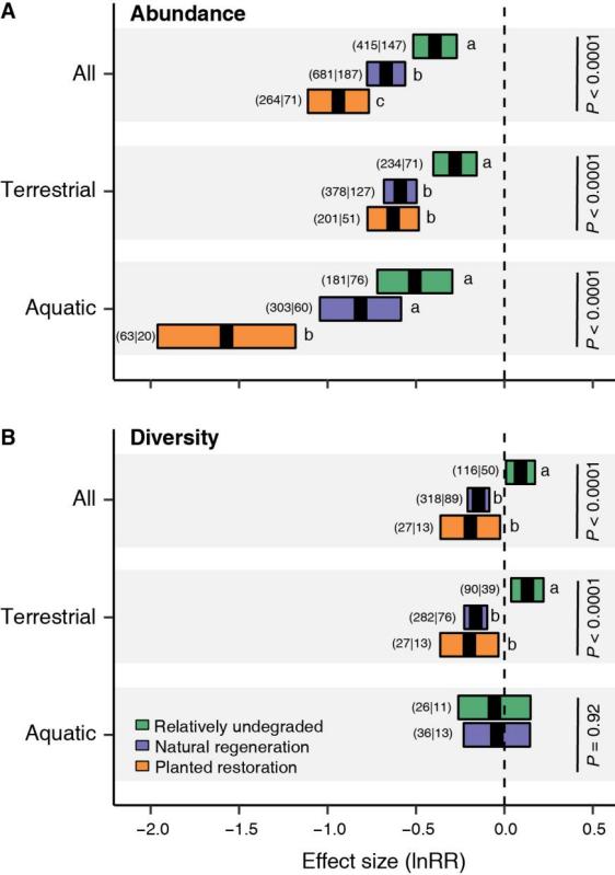 图2自然和修复系统中植食动物对植被多度和多样性的效应量