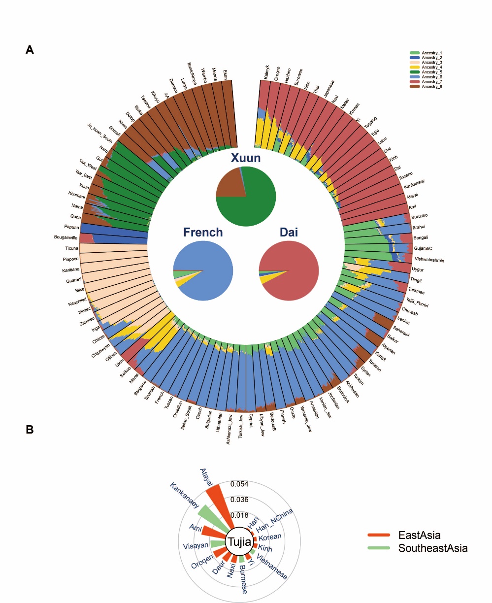 A) Human Origins数据集中随机选取的100个人群的祖源结构(祖源数目设定为8),用“扇形图”绘制。图片中心的三个饼状图显示了三个目标人群(Xuun、French 和 Dai)的祖源结构。 B)Human Origins数据集中土家族与随机选取的 14 个东亚和东南亚人群的遗传距离,用“辐射图”绘制。径向围绕图片核心的条形长度表示遗传距离。
