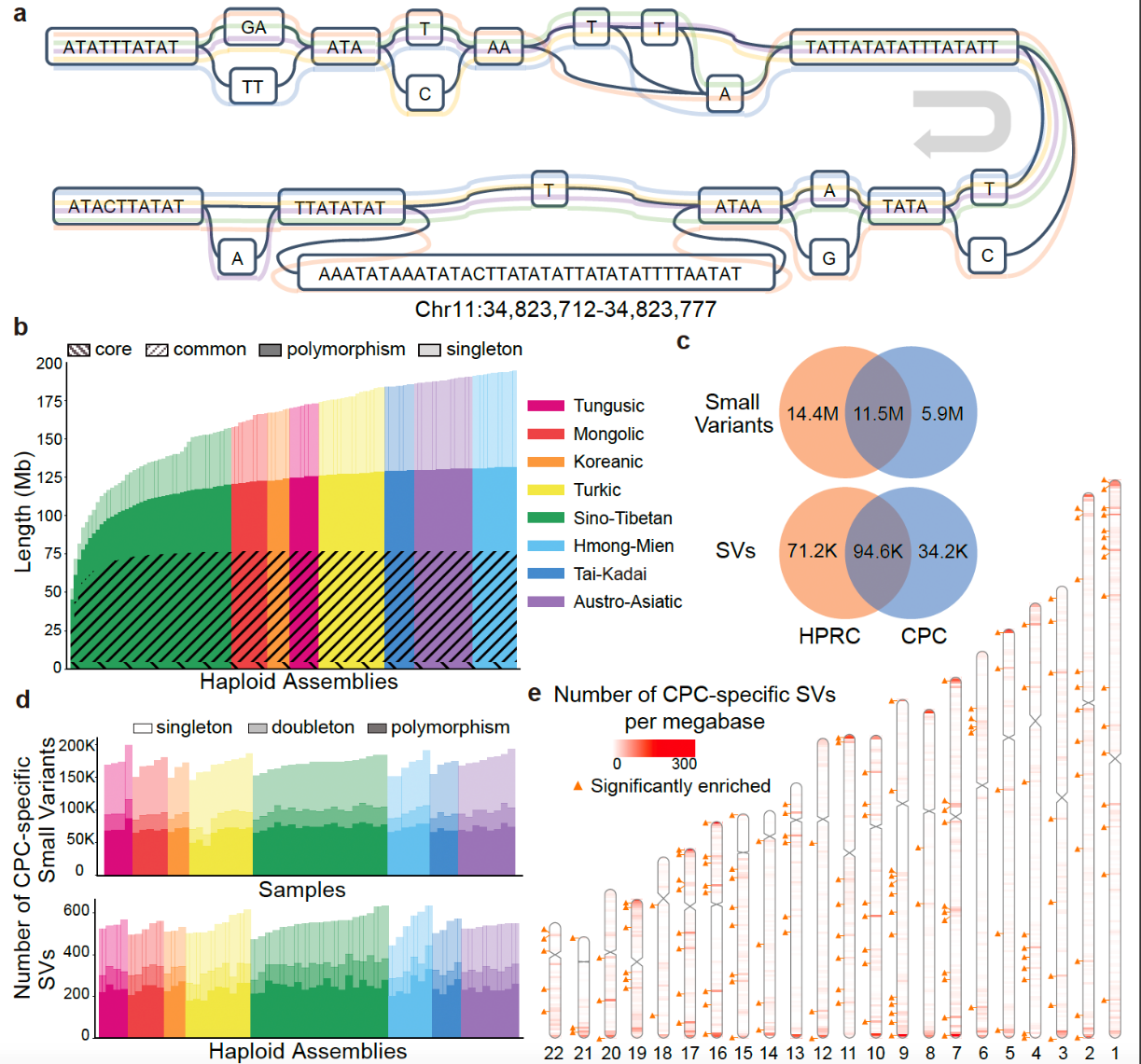 在其第一期研究计划中,CPC对代表中国36个族群的58个样本采用最新的第三代高保真基因组测序技术进行了深度测序,结合最新的单倍型基因组组装方法,获取了116个高质量单倍型基因组,并以图基因组的方式构建了高质量中国人群参考泛基因组。该泛基因组图谱总共包含约3.01 Gb个碱基对的序列信息,在现有人类参考基因组的基础上新增了约1.9亿个碱基对的新序列,包含约590万个小变异(单核苷酸多态性变异和小规模插入/缺失变异)和约3.4万个结构变异(Structural variation, SV),涉及至少1367个蛋白编码基因复制事件等。其中,约500万个碱基对新序列存在于95%以上的单倍型中,被视为中国人群基因组核心序列,可能与中国人群特有的较为稳定的生物学功能或表型特征相关(图2)。