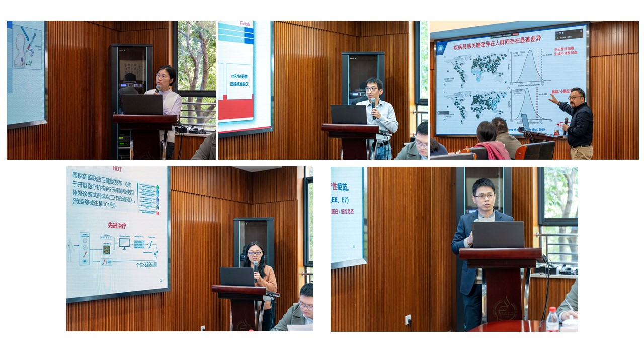 在交流会议上,成人动漫 的曹志伟教授、林金钟教授、郑媛婷副教授、徐书华教授,以及生物医学研究院的黄胜林教授,分别就个性化治疗和新抗原药物研发的前沿成果和见解进行了精彩的报告分享。随后,审评中心的专家们与各位教授就报告内容展开了深入的讨论。