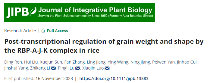 2023年11月16日,成人动漫 罗小金/陆平利团队联合中国农科院黎志康团队在JIntegr Plant Biol期刊上发表了题为“Post-transcriptional regulation of grain weight and shape by the RBP-A-J-K complex in rice (Oryza sativa L.)”的研究论文。该研究采用图位克隆、功能基因组、转录组以及群体基因组的研究方法,发现 RBP-A、RBP-J和 RBP-K编码的蛋白质形成了一个 RBP-A-J-K 复合物,对水稻产量相关性状起负调控作用。