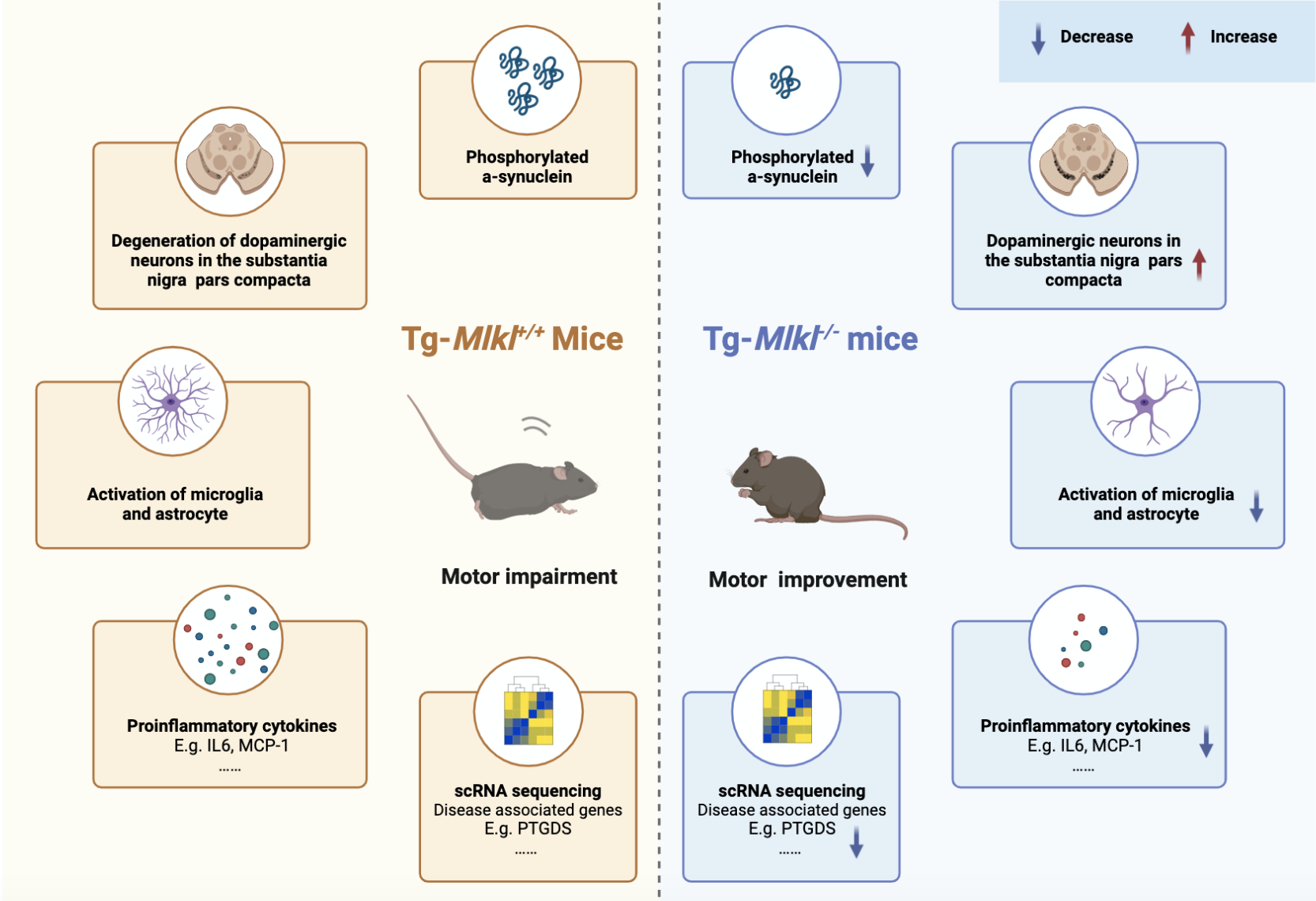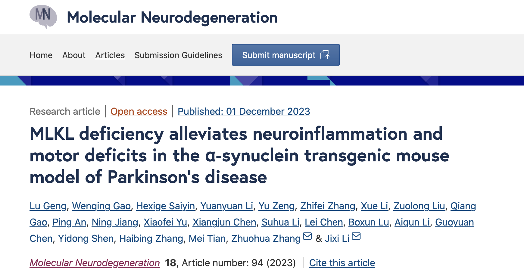帕金森病是一种以多巴胺能神经元丧失和α-突触核蛋白(α-synuclein)聚集为特征的神经系统疾病,但目前缺乏有效治疗手段。成人动漫 /华山医院李继喜教授、中南大学湘雅医院/南华大学张灼华教授合作在细胞程序性坏死调控帕金森病(PD)发生的机制方面取得重要进展,发现MLKL缺失可以显著缓解α-突触核蛋白突变导致的帕金森病模型小鼠的神经炎症和运动障碍症状。12月1日,研究论文以《MLKL deficiency alleviates neuroinflammation and motor deficits in the α-synuclein transgenic mouse model of Parkinson’s disease》为题在线发表在国际神经科学领域权威期刊《分子神经退行性疾病》(Molecular Neurodegeneration)(影响因子:15.1)杂志上。