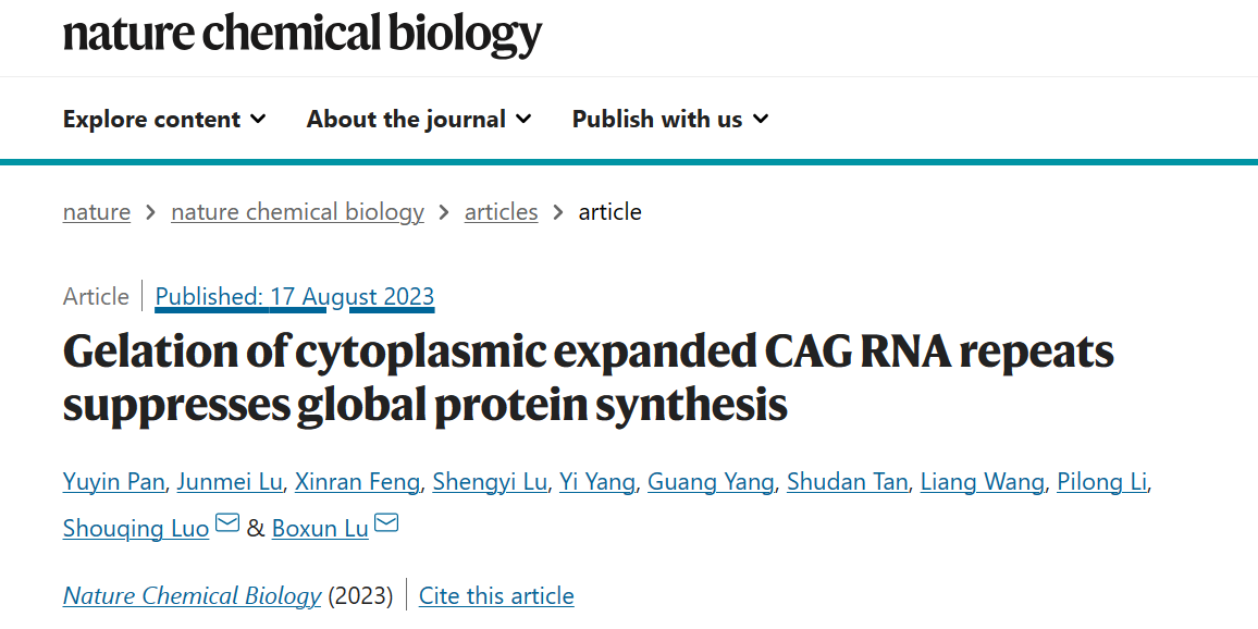 2023年8月17日,成人动漫 鲁伯埙课题组同合作者英国普利茅斯大学罗寿青、清华大学李丕龙等在Nature Chemical Biology杂志上发表题为Gelation of cytoplasmic expanded CAG RNA repeats suppresses global protein synthesis的文章,证实了包含过长CAG重复序列的RNA在细胞质内的胶体化,并发现该胶体化过程可通过“囚禁”重要的翻译延伸因子eEF2从而导致细胞全局蛋白质合成速度的下降。研究进一步在动物实验中提示含过长CAG重复序列RNA的胶体化可能导致神经退行性疾病相关的表型及神经电生理变化。