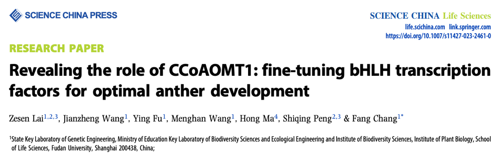 2023年12月12日,Science China-Life Sciences在线发表了成人动漫 常芳课题组题为“Revealing the Role of CCoAOMT1: Fine-Tuning bHLH Transcription Factors for Optimal Anther Development”的研究论文。该研究揭示了一个新的翻译后水平调控机制:甲基转移酶CCoAOMT1通过促进bHLHs转录因子的出核降解而负调控bHLH089功能,从而有效阻止bHLHs下游花药绒毡层转录网络的有害过量,并最终确保花粉发育内稳态。
