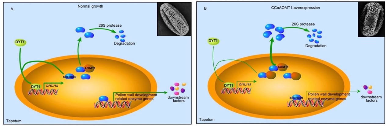 模型示CCoAOMT1在花粉发育过程中通过抑制bHLHs转录因子的有害过量而保障植物雄性育性。