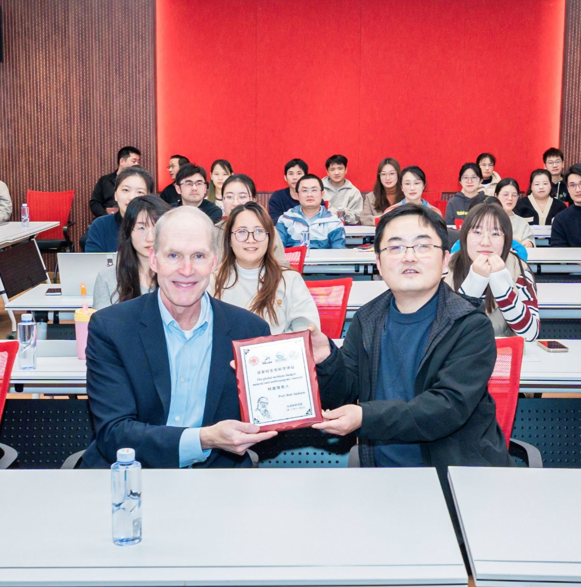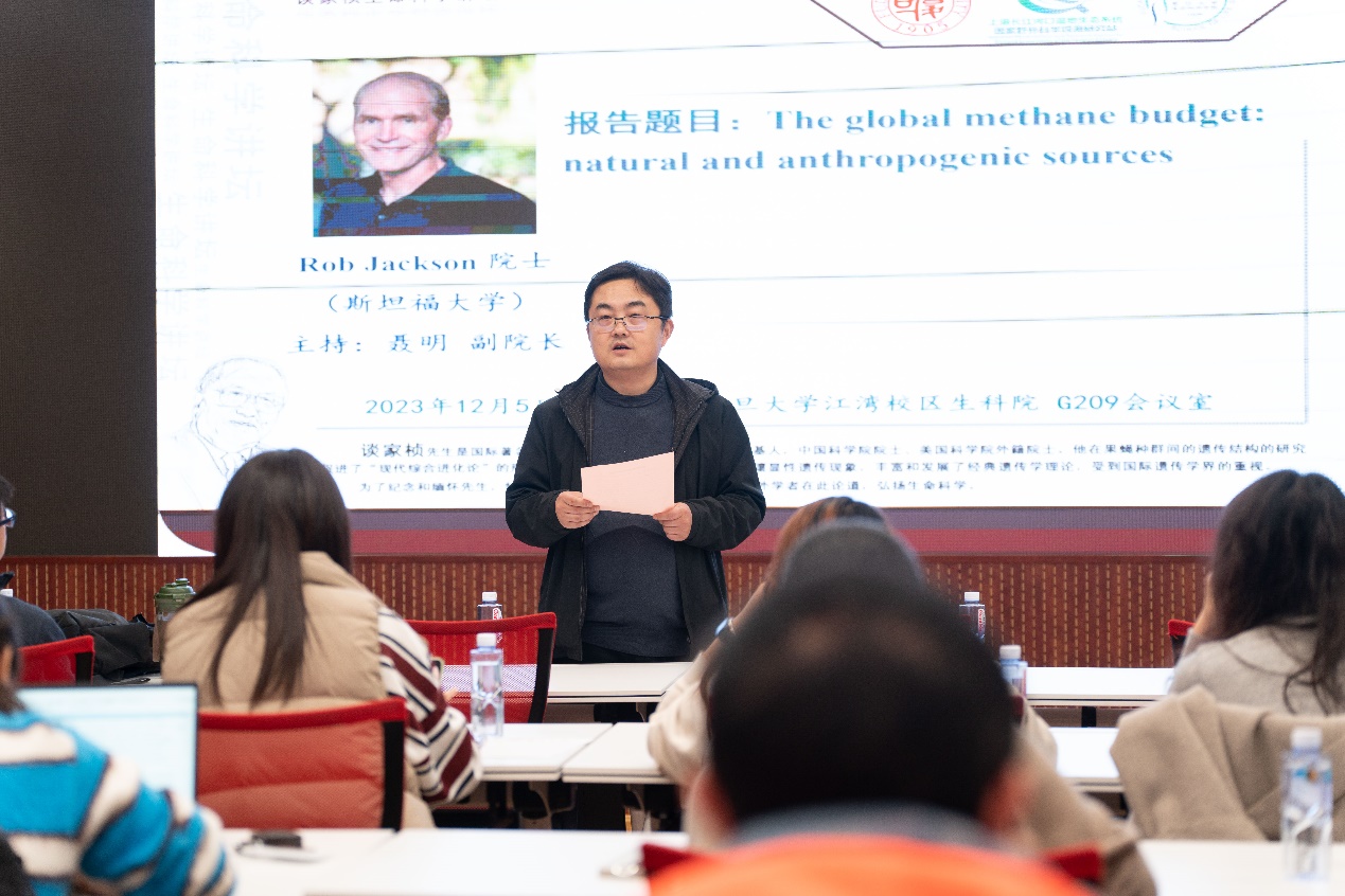聂明副院长主持并致欢迎辞,介绍了Rob Jackson教授杰出的科研工作。Jackson教授致力于研究人类如何影响地球这一宏大议题,以及如何通过基础科学研究塑造及帮助政策制定, 和如何减少全球变暖,能源开采,和其他问题的环境影响。目前,他正深入研究气候变化和干旱对森林和草原生态系统的影响。此外,Jackson目前还致力于通过全球碳计划 (global carbon project)监测和减少温室气体排放。正在进行的研究包括建立和整合了一个的超过80个站点的全球甲烷通量测量网络,以及测量和减少油气井、城市街道、家庭和建筑物的甲烷排放。Jackson教授的学术成就斐然,迄今为止,Jackson教授发表的论文总引用次数达14万次(自2018年的引用次数达7.5万次)。h-index达到162,i10-index高达452。他曾获得美国青年科学家与工程师总统奖,是美国艺术与科学院院士,美国科学促进会成员。